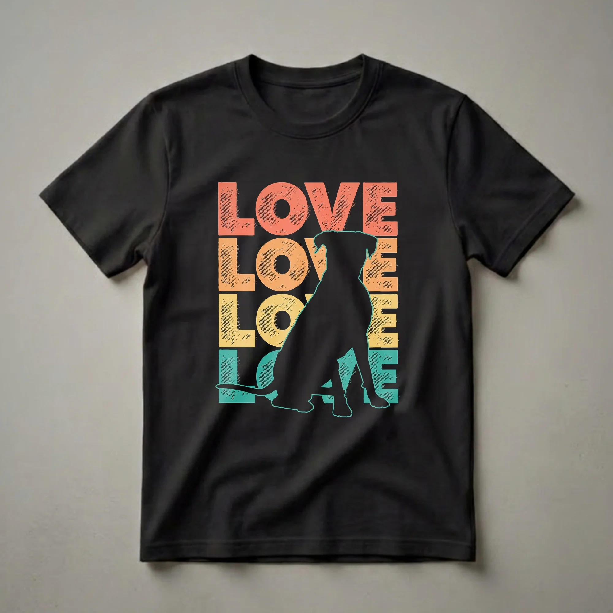 Boxer dog moms know the breed's energetic spirit and affectionate nature. This retro-inspired graphic tee captures that devotion with a striking black silhouette of a sitting Boxer. The word "LOVE" is repeated four times in a vintage color palette of coral, orange, yellow, and teal, each letter textured with a distressed scratch effect. Boxers, originating from Germany, are known for their playful demeanor and loyalty, making them cherished companions. This t-shirt is a fantastic way for any Boxer owner to express their bond with their furry friend. It's a staple in the collection for dog lovers who appreciate unique, retro designs. This shirt works well for casual outings, trips to the dog park, or simply relaxing at home with your beloved pet. It makes a thoughtful gift for birthdays, holidays, or any occasion for the Boxer enthusiast in your life who wants to wear their heart on their sleeve. This tee is a go-to for expressing canine affection.