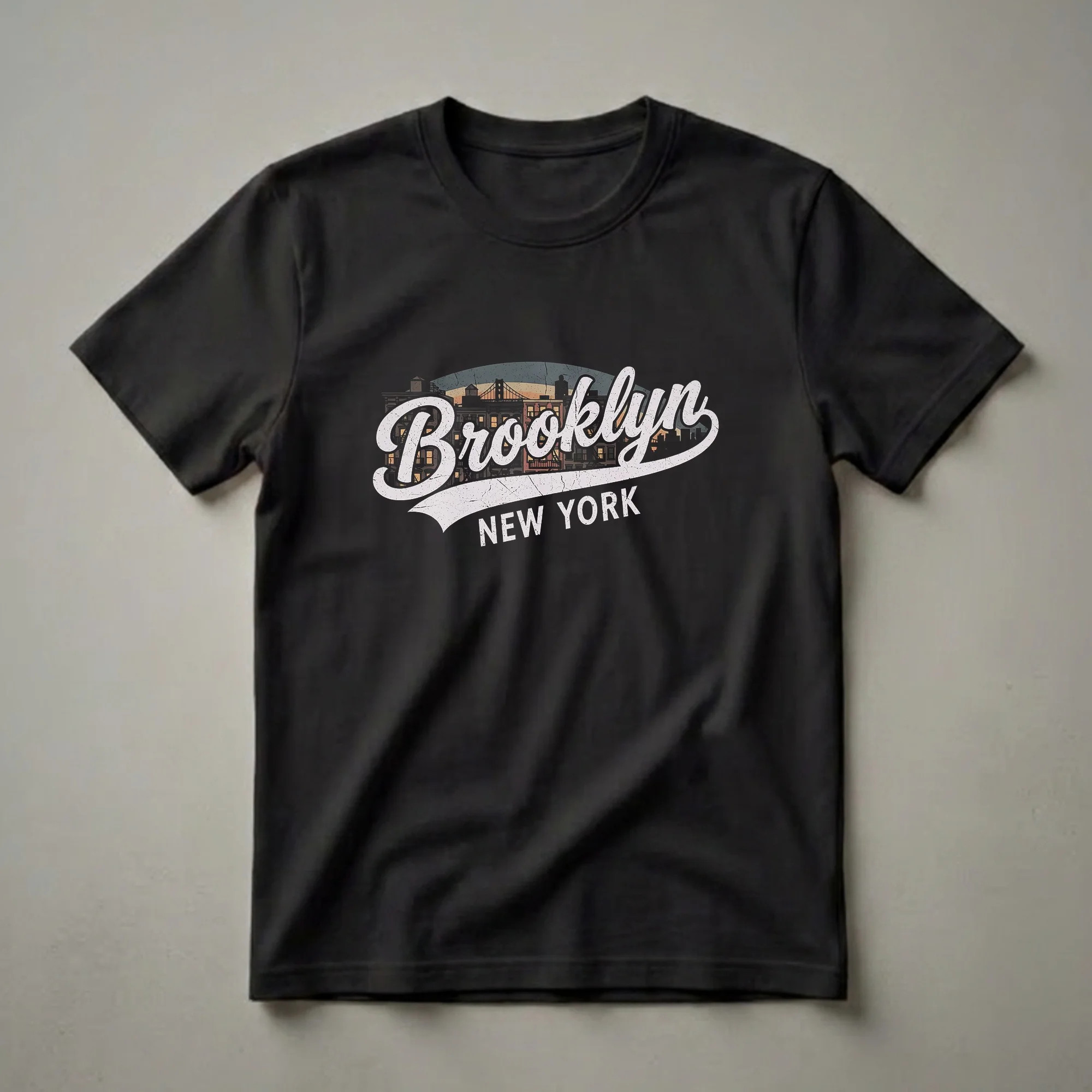 Brooklyn residents and admirers of New York City will reach for this graphic tee to showcase their urban pride. The design features a stylized, retro depiction of the Brooklyn skyline, complete with iconic buildings and a prominent bridge silhouetted against a distressed, sunset-hued sky. The word "Brooklyn" is emblazoned across the front in a classic script font, with "New York" written below in a bold, block style. This t-shirt captures the unique spirit and aesthetic of one of the world's most famous boroughs. Brooklyn, a borough of New York City, is known for its diverse neighborhoods, vibrant arts scene, and rich history, making this shirt a conversation starter for anyone who appreciates its character. It makes a thoughtful gift for New Yorkers, former residents, or anyone who dreams of visiting the Big Apple. Wear this shirt to explore the city, meet up with friends, or simply as a daily reminder of your connection to Brooklyn. This comfortable tee is a staple for anyone who loves the energy and iconic imagery of New York City.