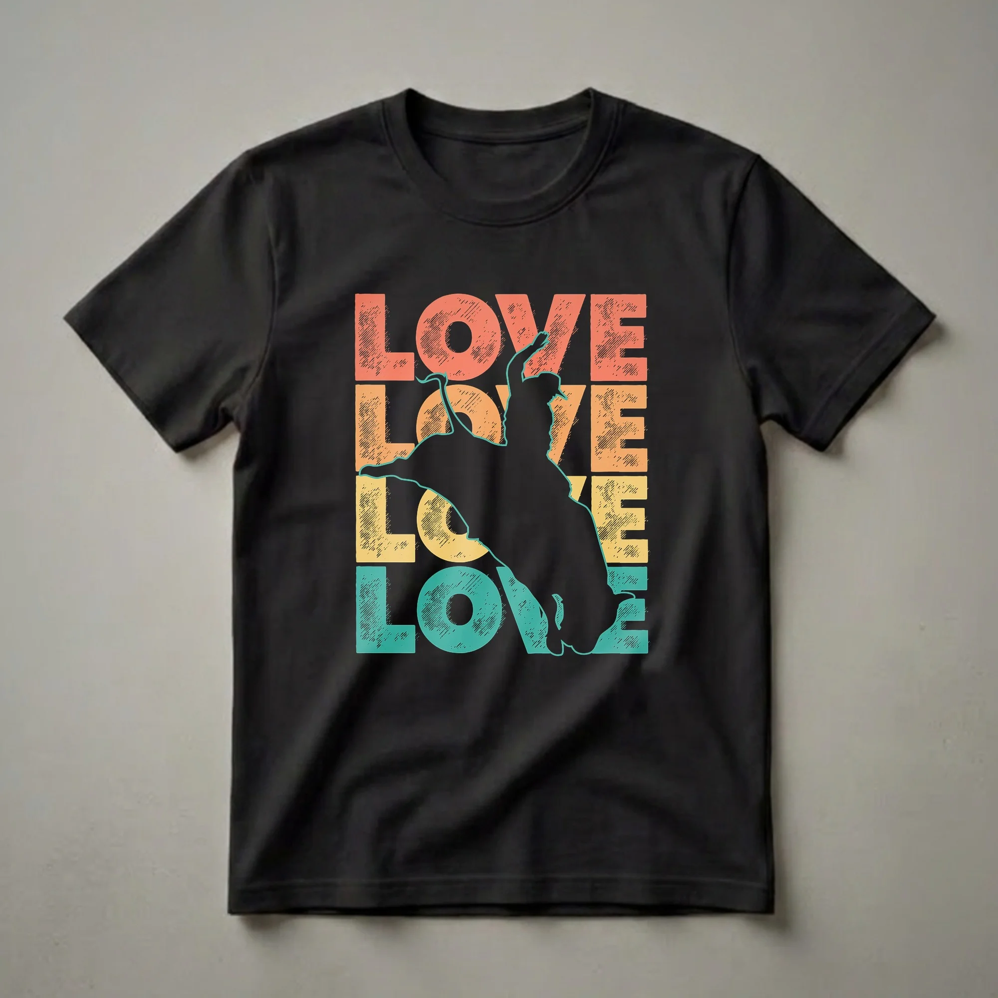 Rodeo fans who appreciate the thrill of bull riding will reach for this eye-catching graphic tee. The design features a bold black silhouette of a cowboy expertly balancing on a bucking bull, a dynamic representation of the sport. This image is layered over stacked, retro-colored blocks spelling out the word 'LOVE' in distressed fonts, creating a vintage aesthetic. The colors include a warm coral, a vibrant orange, a sunny yellow, and a cool teal, all set against a black background. Bull riding, a rodeo event where a rider attempts to stay mounted on a bucking bull for eight seconds, is a test of skill, strength, and courage. This shirt makes a thoughtful gift for anyone who loves the excitement of the rodeo, whether they are participants, spectators, or simply admire the cowboy way of life. Wear this t-shirt to your next rodeo event, country music concert, or casual outing to showcase your passion for this exhilarating sport.