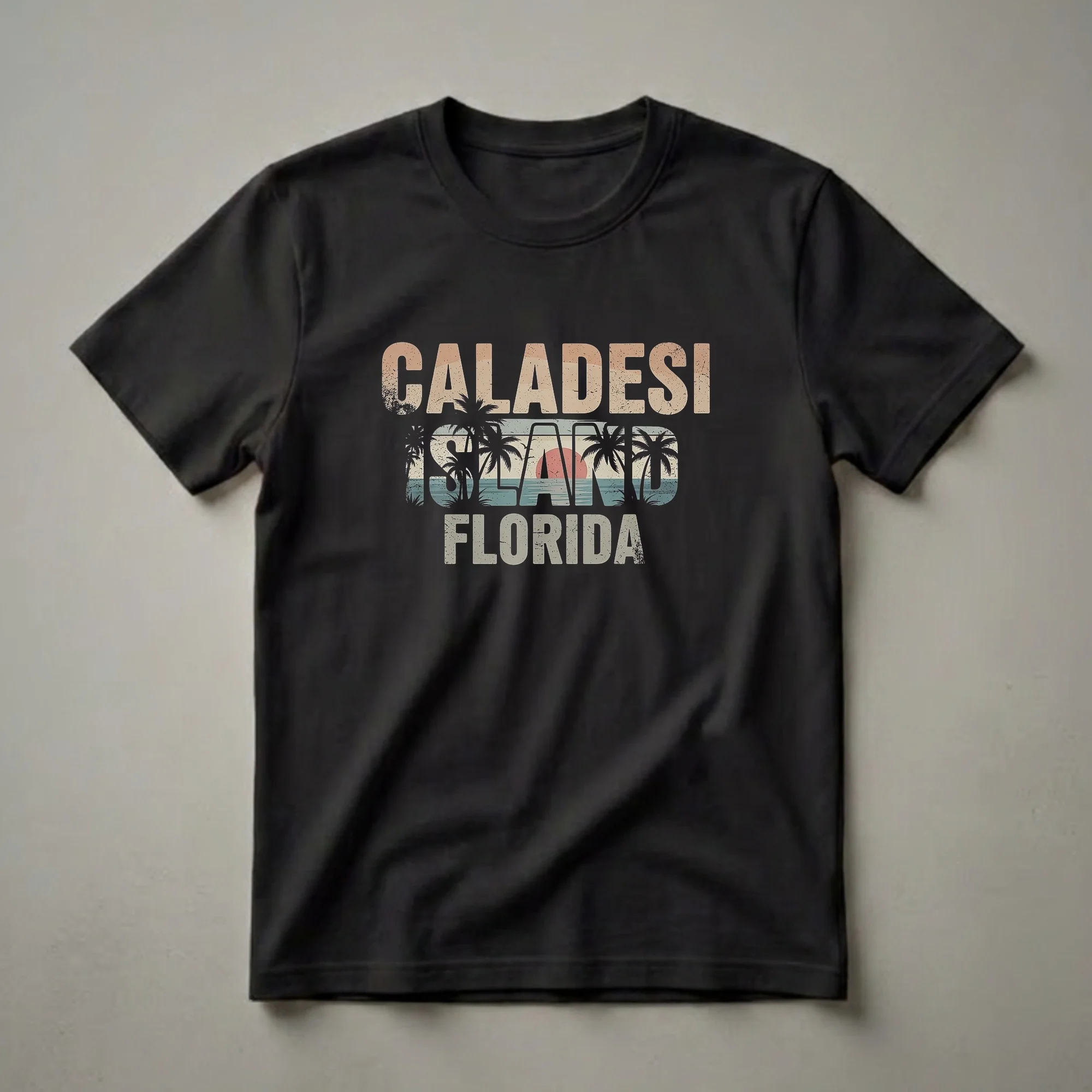 Caladesi Island State Park, located on Florida's Gulf Coast near Dunedin, offers a pristine natural escape. This retro-inspired graphic tee captures the essence of this beautiful barrier island with its vintage sunset design. The graphic features the words "CALADESI ISLAND FLORIDA" layered over a stylized scene of palm trees, a tranquil ocean, and a setting sun. The muted, earthy color palette and distressed texture evoke a sense of nostalgia, reminiscent of classic travel souvenirs. Caladesi Island is renowned for its undeveloped beaches, mangrove forests, and abundant wildlife, making it a popular destination for kayaking, shelling, and enjoying the natural Florida coastline. This shirt is a thoughtful gift for anyone who has visited or dreams of visiting this unique Florida gem. It's a staple for beachgoers, nature enthusiasts, or anyone looking to bring a piece of the Sunshine State home. Wear this tee to remember your Florida vacation or to inspire your next trip to the coast. This comfortable t-shirt is a go-to for casual outings, beach days, or simply relaxing.