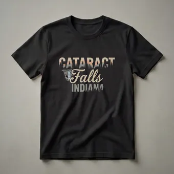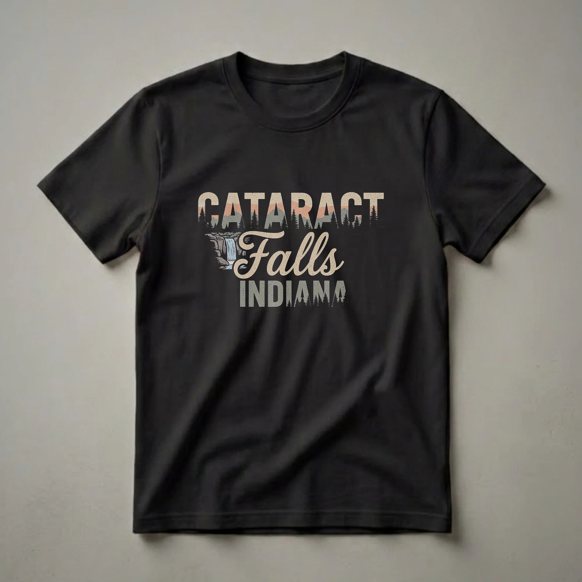 Celebrate the natural beauty of Indiana with this artistic graphic tee featuring the iconic Cataract Falls drawing. The design features a stylized depiction of Cataract Falls, a prominent waterfall located in Owen County, Indiana. This scenic spot is part of the Lieber State Recreation Area, known for its picturesque landscapes and outdoor recreational opportunities. The artwork incorporates a retro aesthetic with a muted color palette, showcasing rolling hills, evergreen trees, and the cascading water of the falls. The text 'CATARACT Falls INDIANA' is prominently displayed, making it clear this shirt celebrates a specific Indiana landmark. This t-shirt works well for anyone who enjoys hiking, exploring state parks, or simply wants to represent their home state with a touch of vintage flair. It makes a thoughtful gift for friends and family who have a connection to Indiana or a fondness for natural scenery. Wear it on your next outdoor adventure or casual outing to share your appreciation for Indiana's natural wonders. This comfortable tee is a great way to carry a piece of Indiana with you, whether you're exploring local trails or reminiscing about past trips.