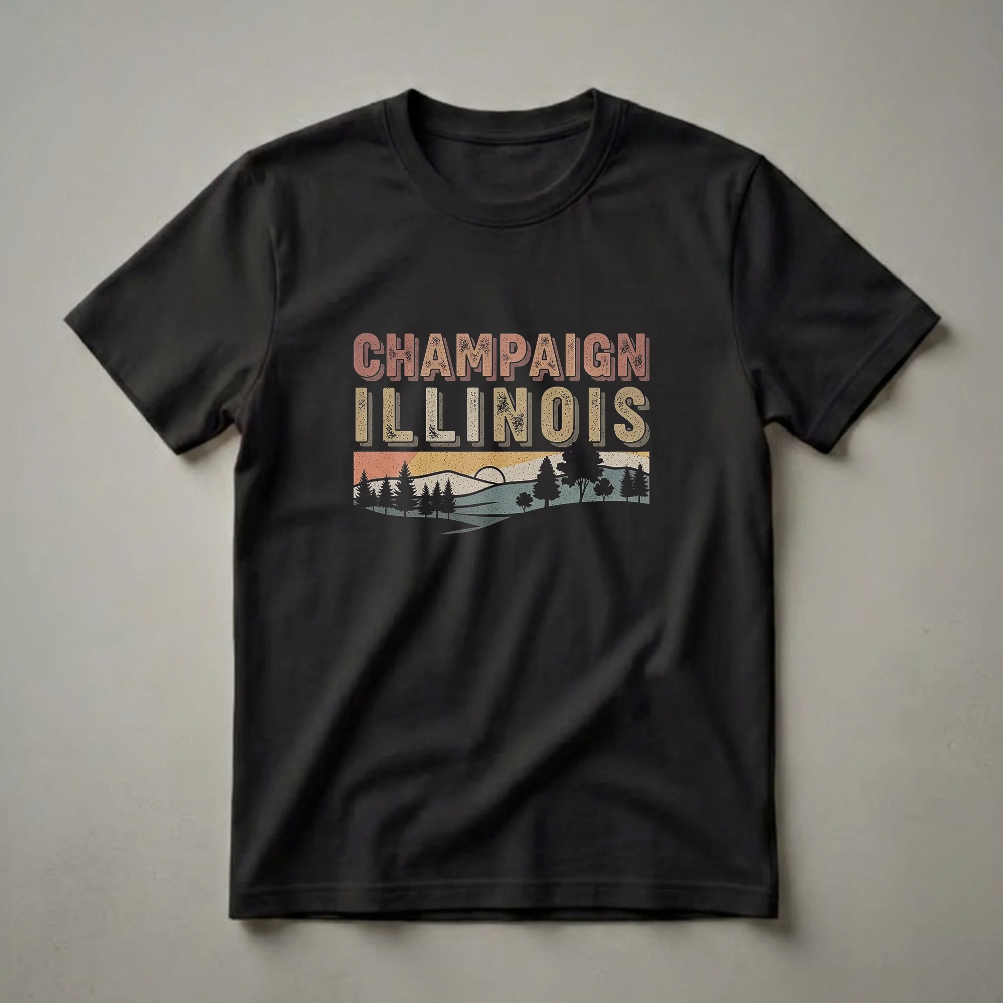 - Vintage-inspired graphic tee celebrating Champaign, Illinois with retro landscape art.
