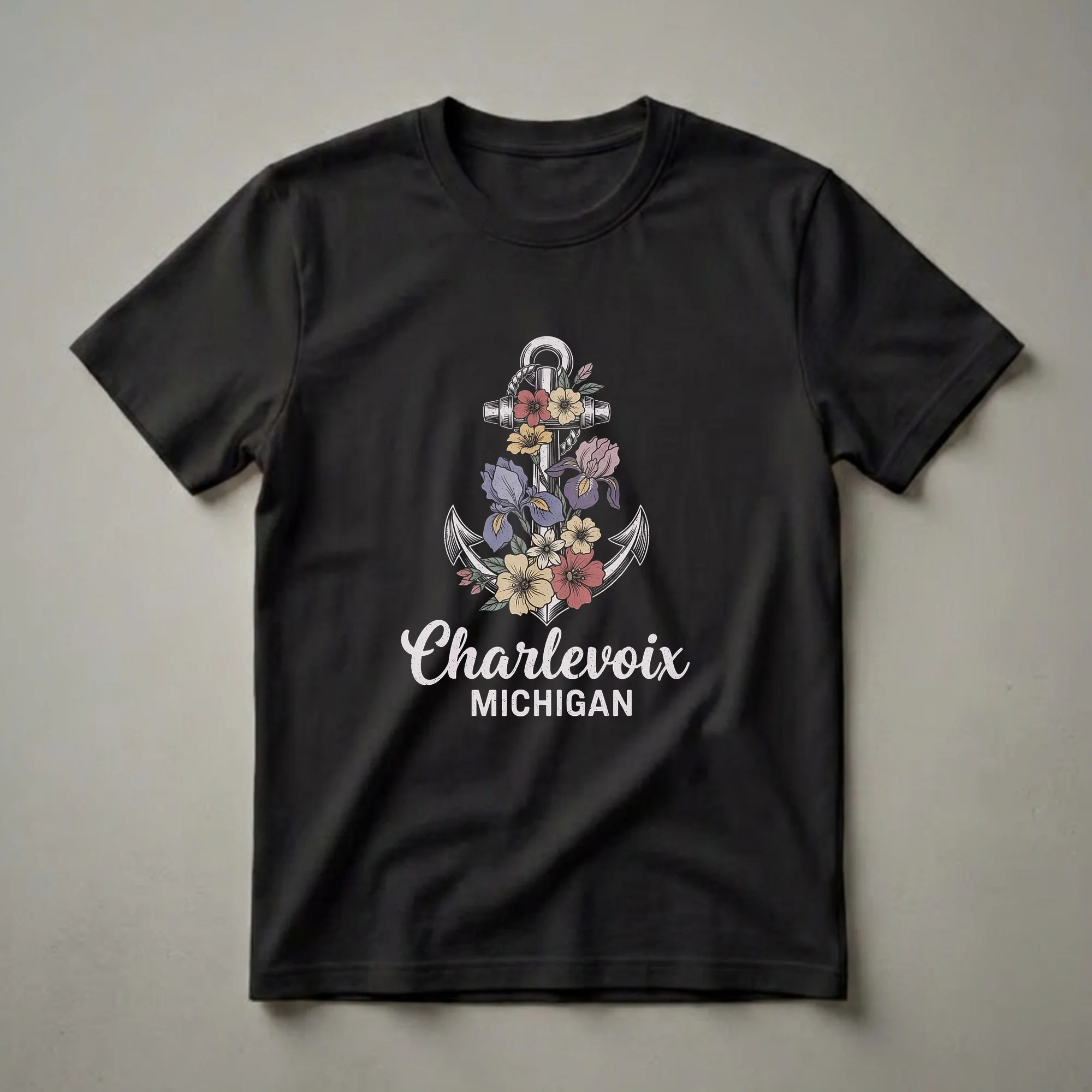 Charlevoix, Michigan, a charming city nestled between Lake Michigan and Lake Charlevoix, is celebrated with this unique graphic tee. The design features a classic anchor, a symbol of maritime heritage and stability, intricately intertwined with a vibrant bouquet of colorful flowers. This artistic representation blends nautical themes with natural beauty, reflecting the picturesque landscapes of Northern Michigan. The anchor, rendered in a vintage style with textured detailing, is softened by the presence of red, yellow, purple, and pink blossoms, along with delicate green leaves. Below the anchor and floral arrangement, the name 'Charlevoix' is elegantly scripted, followed by 'MICHIGAN' in a bold, block font. This shirt is a wonderful way for residents and visitors to express their connection to this beloved Great Lakes destination. It makes a thoughtful gift for anyone who has fond memories of Charlevoix, whether it's from summer vacations, boating on the lakes, or simply enjoying the town's unique character. Wear this tee to casual outings, beach days, or while exploring the charming streets of Charlevoix.