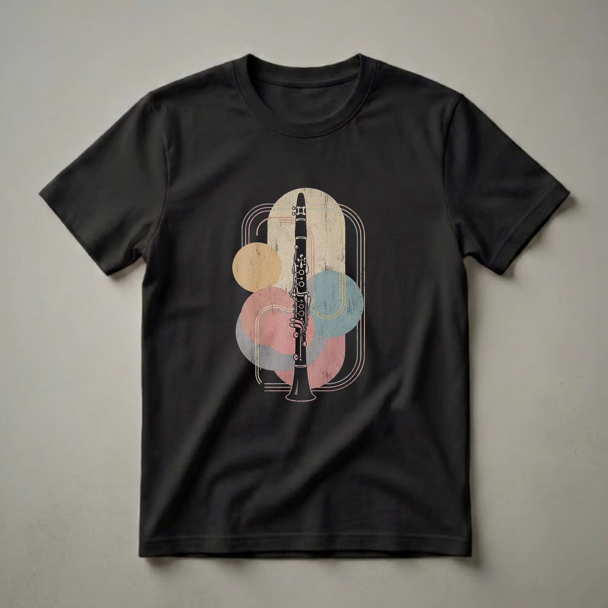 Clarinet players who appreciate vintage aesthetics will reach for this striking graphic tee. The design features a detailed black silhouette of a clarinet, a versatile woodwind instrument known for its wide tonal range and expressive capabilities, set against a backdrop of abstract, textured shapes in muted pastel colors like dusty rose, muted yellow, and soft teal. These shapes are overlaid with subtle linear elements, creating a retro, art deco-inspired feel. The clarinet itself is depicted with intricate detail, showcasing its keys and tone holes, a testament to the instrument's complexity. This shirt is a thoughtful gift for any clarinetist, whether they play in a jazz ensemble, a classical orchestra, or a marching band. It makes a unique present for music students, band directors, or anyone who finds joy in the rich sound of the clarinet. Wear this t-shirt to rehearsals, concerts, or casual outings to express your passion for music and your instrument.