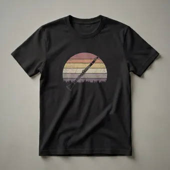 Woodwind musicians who appreciate vintage aesthetics will reach for this striking graphic tee. The design features a detailed silhouette of a clarinet, its keys and bell clearly defined, set against a retro-style sunset. This sunset is composed of horizontal stripes in muted tones of purple, grey, tan, and orange, all textured with a distressed, scratched effect that evokes a nostalgic feel. Below the sunset, a dense silhouette of pine trees creates a natural landscape. The clarinet, a single-reed woodwind instrument, is known for its wide range and expressive tone, making it a staple in orchestras, concert bands, and jazz ensembles. This shirt is a thoughtful gift for clarinetists, band directors, or music students who want to display their passion for their instrument. It’s a great conversation starter at band practice, music recitals, or casual gatherings where fellow musicians can connect over their shared love for the clarinet. Wear this tee to your next rehearsal or simply as a stylish everyday statement piece.