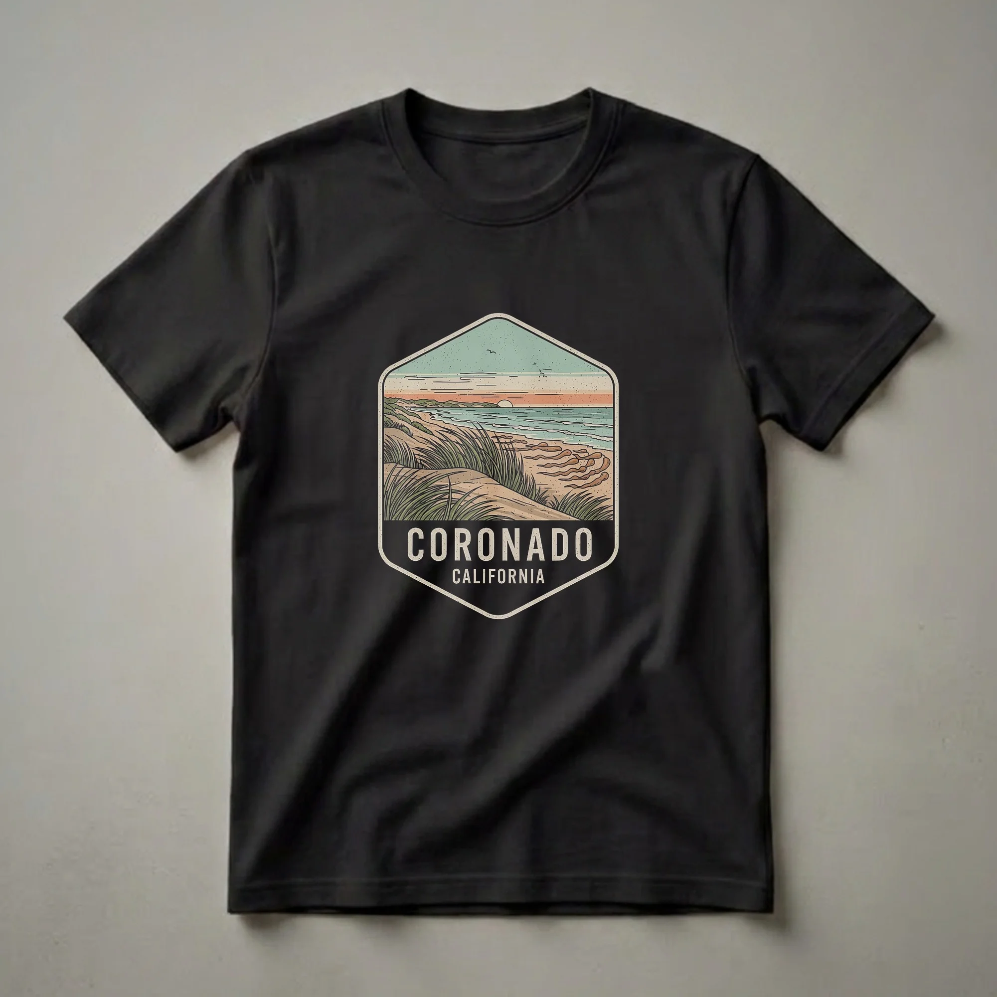 Coronado, California, a picturesque island city known for its stunning beaches and historic Hotel del Coronado, is celebrated on this retro-inspired graphic tee. The design features a hexagonal badge showcasing a serene beach sunset scene. Rolling sand dunes covered in tall, wispy grass lead down to the ocean, where gentle waves meet the shore under a sky painted with warm hues of orange and teal. Silhouettes of distant hills frame the horizon as the sun dips low. This t-shirt is a thoughtful gift for anyone who has fond memories of visiting or living in Coronado, or for those who appreciate vintage travel aesthetics. It's a staple in the collection for beach lovers and California enthusiasts. Wear this shirt to remember your favorite coastal getaways or to bring a piece of the sunny California coast with you wherever you go. This apparel is a great way to showcase your love for this iconic beach destination.