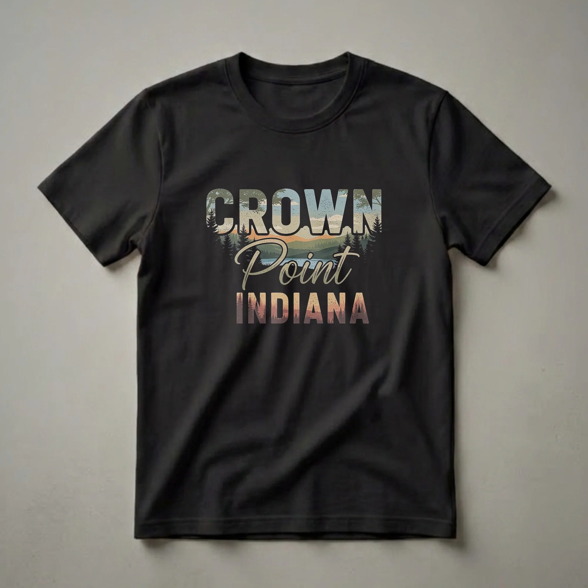 Crown Point, Indiana residents and visitors can now showcase their hometown pride with this striking retro graphic tee. The design features the words "CROWN POINT INDIANA" filled with a vintage landscape scene. This scenic vista includes silhouetted pine trees in the foreground, a serene lake reflecting the sky, and rolling hills or mountains in the distance, all rendered in a muted, earthy color palette. The "CROWN" text is in a bold, distressed font, while "Point" is in a flowing script, and "INDIANA" is in a blocky, textured style. This t-shirt works well for anyone who has a connection to the city, whether they grew up there, have family there, or simply enjoy visiting. It makes a thoughtful gift for a friend or family member who cherishes their roots in Northwest Indiana. Wear this shirt to local events, casual outings, or while exploring the natural beauty of the region. Crown Point is known for its historic courthouse square and its proximity to the Indiana Dunes National Park, offering a blend of small-town charm and access to outdoor recreation. This apparel is a unique way to represent your appreciation for this Midwestern gem.
