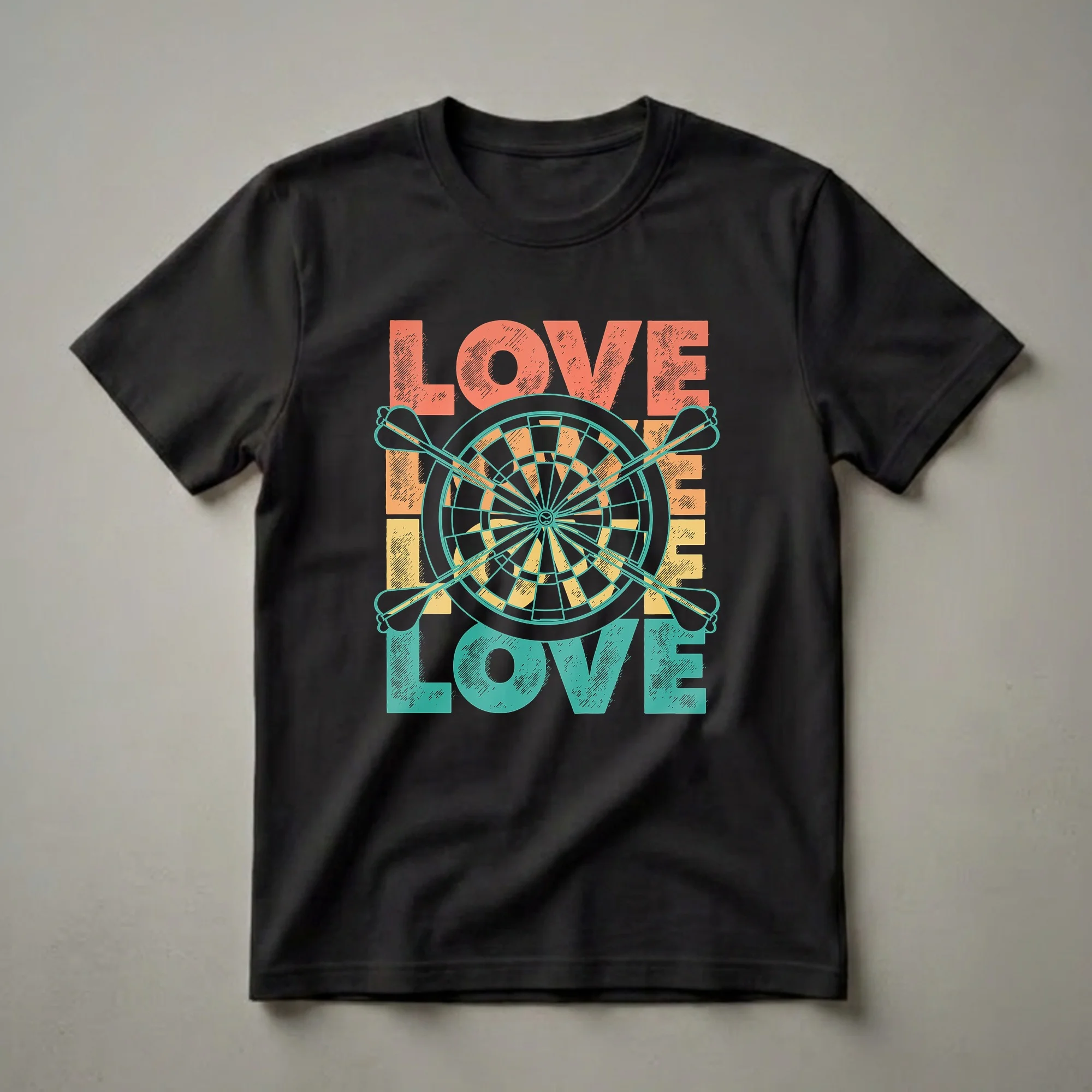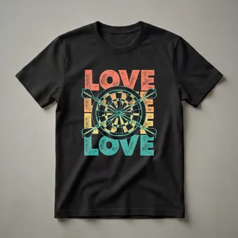 Dart players who live and breathe the game will reach for this eye-catching tee. The design showcases the word 'LOVE' in a bold, retro font, layered with a classic dartboard and crossed darts. This graphic t-shirt captures the essence of the sport, celebrating the dedication and passion that dart enthusiasts bring to the oche. Darts, a game of precision and focus, has a rich history dating back to medieval times, evolving into the competitive sport enjoyed worldwide today. Whether you're aiming for a triple 20 or just enjoying a casual game with friends, this shirt is a statement piece. It makes a thoughtful gift for the dart player in your life, great to wear to league nights, tournaments, or casual gatherings. Celebrate your love for darts with this unique and stylish apparel.