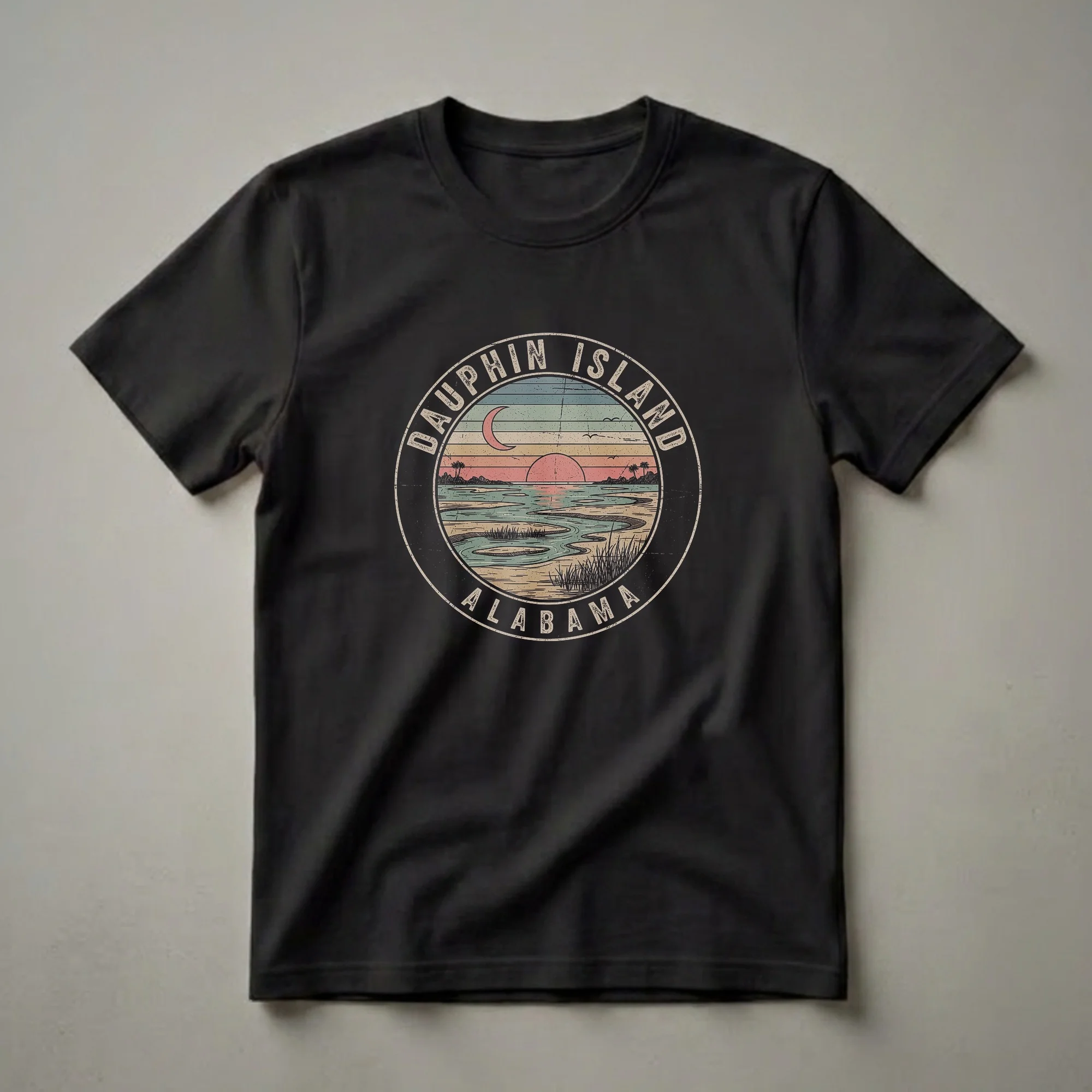 Dauphin Island, Alabama, a barrier island known for its natural beauty and coastal charm, is celebrated in this retro-inspired graphic tee. The design features a circular emblem depicting a serene sunset scene over the water. A prominent crescent moon hangs in the sky, accompanied by silhouetted palm trees and distant shorelines, evoking a sense of tropical tranquility. The water is rendered with winding channels and marshy reeds, suggesting the island's unique estuarine environment. This shirt is a thoughtful gift for anyone who cherishes memories of Dauphin Island, whether they are locals, frequent visitors, or simply appreciate coastal landscapes. It's a go-to tee for casual outings, beach trips, or simply relaxing while reminiscing about the Gulf Coast. The vintage aesthetic makes this t-shirt a stylish way to showcase pride for Alabama's coastal gem. Wear it to your next beach gathering or as a reminder of your favorite island getaway. This apparel is a unique way to represent your connection to this beautiful part of Alabama.