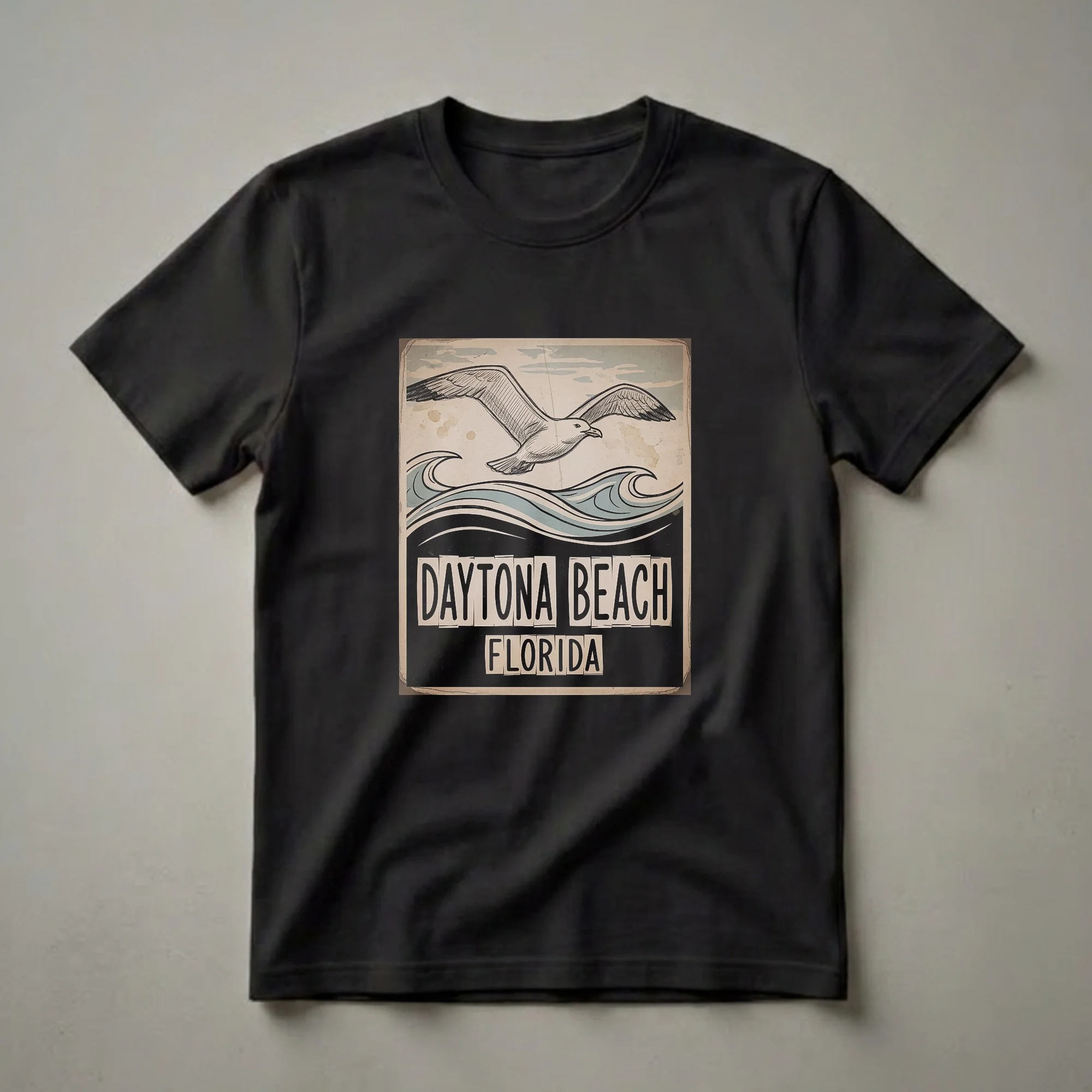 Daytona Beach, Florida, is a destination synonymous with sun, sand, and surf, and this graphic tee captures that classic coastal charm. The design features a striking, hand-drawn style seagull soaring above stylized blue and white ocean waves, set against a backdrop reminiscent of vintage travel posters. Below the imagery, bold, block-style lettering clearly spells out "DAYTONA BEACH" and "FLORIDA," evoking a sense of nostalgia for beach vacations and road trips. This t-shirt is a thoughtful gift for anyone who has fond memories of visiting this iconic Florida locale, or for those who dream of its shores. It's a staple piece for beachgoers, surfers, or anyone who loves the laid-back atmosphere of the Sunshine State. Wear this shirt to your next beach outing, a casual day exploring the boardwalk, or simply as a reminder of your favorite Florida getaway. The retro aesthetic makes it a unique addition to any casual wardrobe, appealing to those who appreciate vintage travel art and coastal vibes. This tee is a go-to for expressing your love for Daytona Beach and its vibrant seaside spirit.