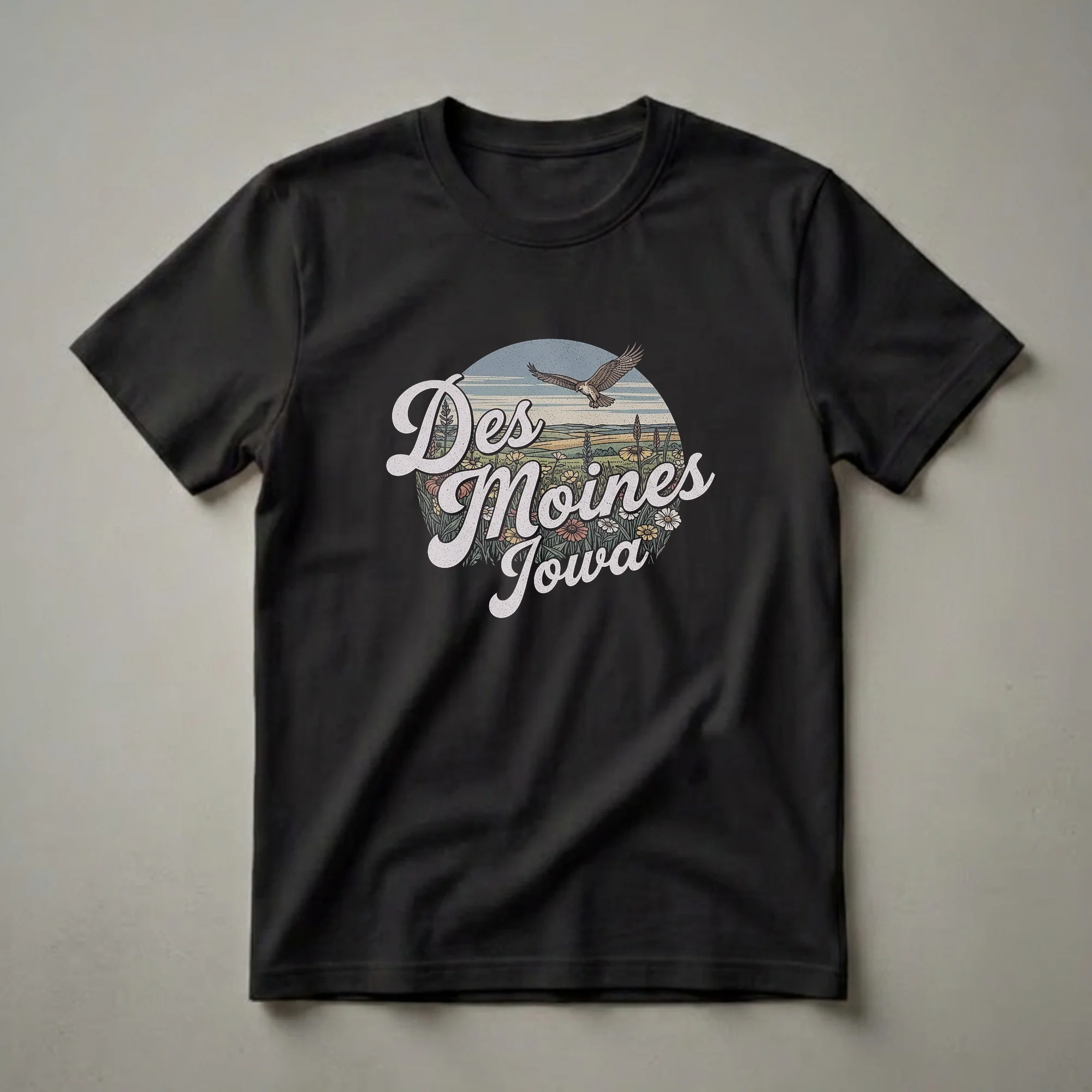 Des Moines, Iowa residents and visitors can now wear their state pride with this eye-catching graphic t-shirt. The design showcases a circular emblem filled with a vibrant scene of rolling Iowa plains, dotted with colorful wildflowers and tall grasses. Above this idyllic landscape, a majestic eagle soars through a sky with subtle striped clouds, evoking a sense of freedom and the natural beauty of the region. The words "Des Moines Iowa" are elegantly scripted across the foreground, rendered in a classic retro font that gives the entire piece a nostalgic feel. This shirt is a wonderful way for anyone who calls Iowa home, or who has fond memories of the state, to express their connection. It makes a thoughtful gift for friends, family, or anyone celebrating their roots in the Hawkeye State. Imagine wearing this tee to a local farmers market, a casual outing with friends, or while exploring the scenic beauty of Iowa. This t-shirt is a unique piece of apparel that captures the spirit of Des Moines and the surrounding plains, offering a stylish nod to the heartland.