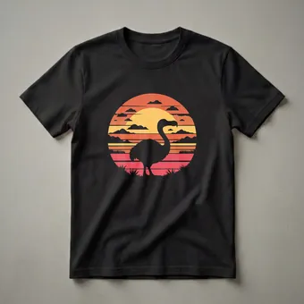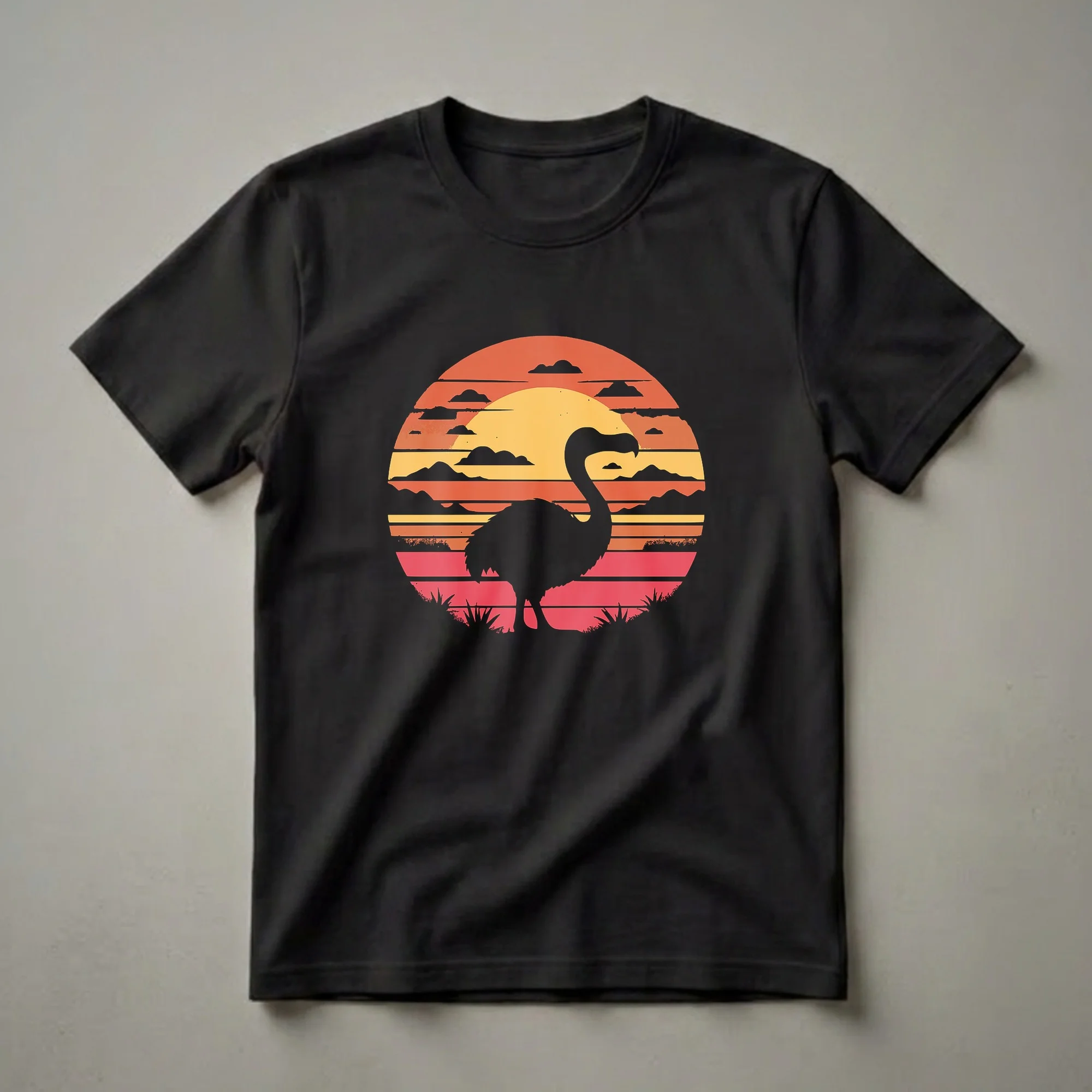 Dodo bird enthusiasts will appreciate this striking graphic tee featuring a silhouette of the extinct bird against a vibrant retro sunset. The design showcases the dodo in profile, standing amidst stylized grass and foliage, with layered mountains and clouds forming the backdrop of the sunset. The sun itself is a large, warm orb, casting hues of orange, yellow, and red across the horizon, creating a nostalgic, vintage aesthetic. The dodo, a flightless bird native to Mauritius, became extinct in the late 17th century due to human activity and introduced species. This shirt serves as a unique conversation starter, celebrating a creature that has captured the imagination of many. It's a thoughtful gift for ornithologists, paleontology buffs, or anyone who appreciates unique animal art and retro designs. This t-shirt works well for casual outings, nature walks, or as a statement piece for a themed event. Wear it to express your fascination with natural history and extinct species.