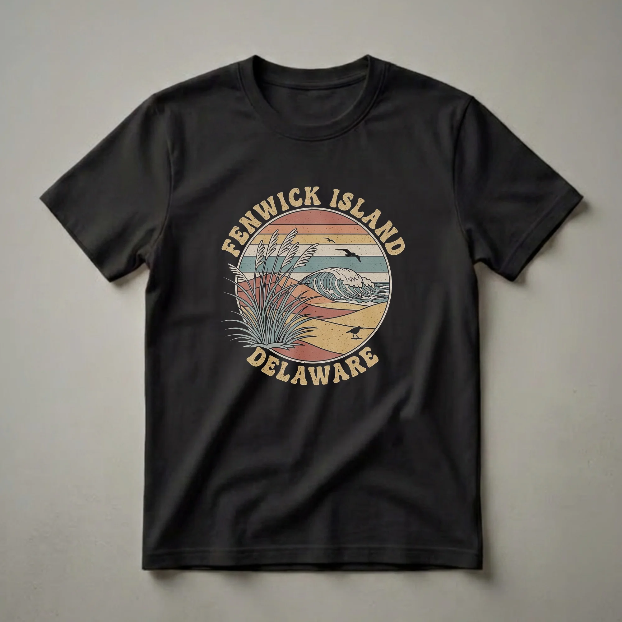 Fenwick Island, Delaware, a charming coastal town, is celebrated on this retro-inspired graphic tee. The design showcases a circular scene with a vintage sunset, featuring warm horizontal stripes in shades of orange, yellow, and teal. Tall, wispy beach grass in the foreground frames a dynamic ocean wave crashing onto sandy dunes. Two seagulls soar in the sky, adding to the coastal atmosphere. A small shorebird stands on the sand, completing the serene beach landscape. This t-shirt is a thoughtful gift for anyone who cherishes memories of Fenwick Island or dreams of its sandy shores. It's a staple in the collection for Delaware residents or visitors looking to commemorate their time in this picturesque location. Wear this shirt to your next beach outing or casual gathering to showcase your love for the Delaware coast.
