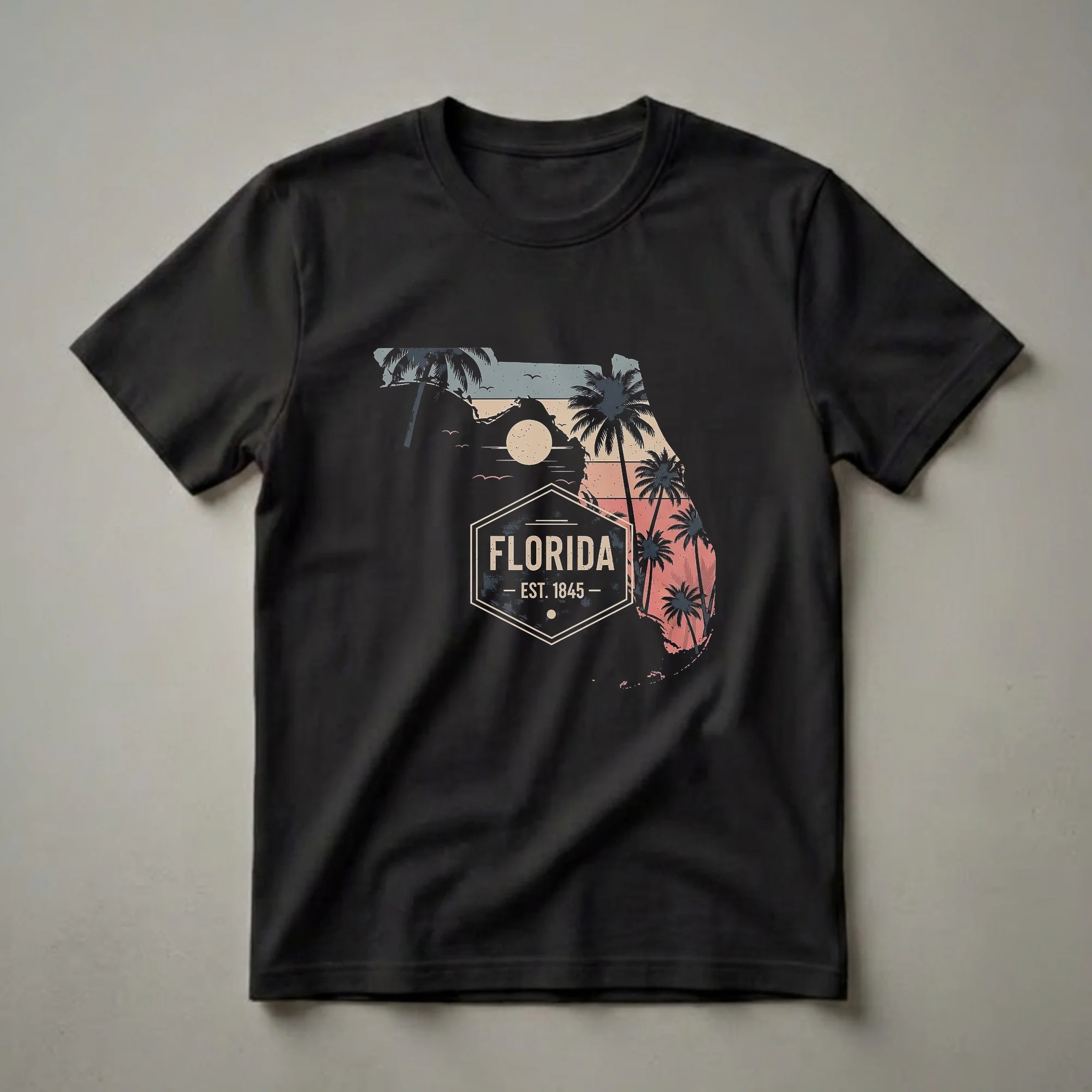 Florida residents and travelers who appreciate the unique charm of the Sunshine State will reach for this graphic tee. The design showcases the iconic outline of Florida, filled with a stylized retro sunset scene. Silhouetted palm trees stand tall against a backdrop of muted horizontal stripes in shades of peach, beige, and dusty blue, evoking a classic beach vibe. Centered within the map is a hexagonal badge bearing the state's name, 'FLORIDA', above 'EST. 1845', marking its official establishment. This detail highlights Florida's rich history, which began with its territorial period in 1821 and its eventual statehood in 1845. The overall aesthetic is reminiscent of vintage travel posters and classic Americana. This t-shirt works well for anyone who has fond memories of the state, whether they grew up there, are planning a vacation, or simply admire its tropical allure. It makes a thoughtful gift for friends and family who have a connection to Florida, perhaps for a birthday or as a souvenir from a memorable trip. Wear this shirt to casual outings, beach days, or while exploring the vibrant cities and natural beauty Florida offers.