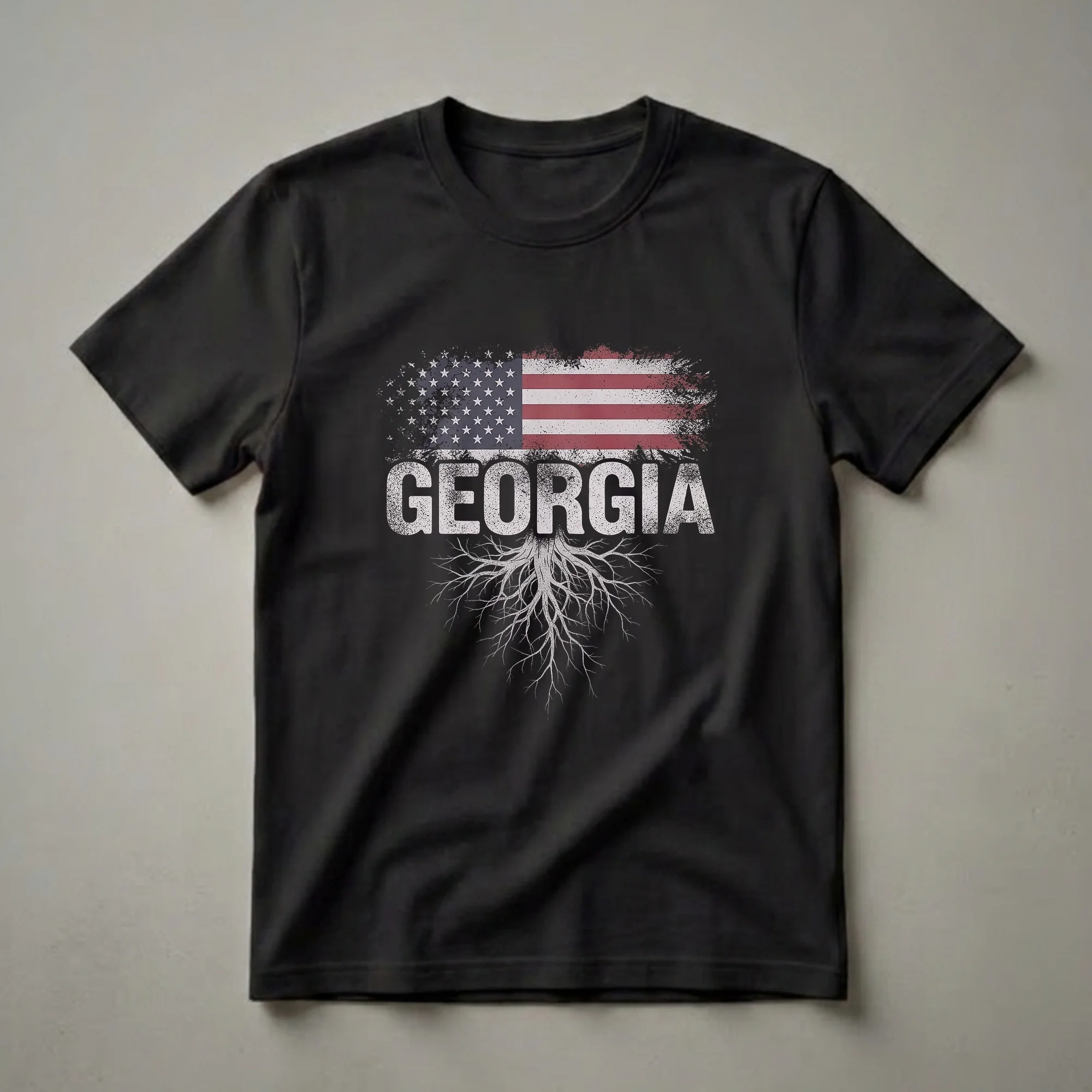 Georgians who want to display their state pride will reach for this unique graphic tee. The design features a distressed American flag graphic positioned above the bold, textured word "GEORGIA." Extending downwards from the lettering are intricate, detailed tree roots, symbolizing deep connections and heritage. This visual metaphor speaks to the strong sense of belonging and history many feel for the Peach State. Georgia, known for its diverse landscapes ranging from the Appalachian Mountains in the north to its extensive coastline along the Atlantic, offers a rich tapestry of culture and heritage. This shirt is a thoughtful gift for anyone who calls Georgia home, whether they've lived there their whole life or have recently put down roots. It’s a great way to wear your state identity, a thoughtful choice for casual outings, local events, or simply showing off your connection to the state. This t-shirt serves as a constant reminder of your origins and pride in Georgia.