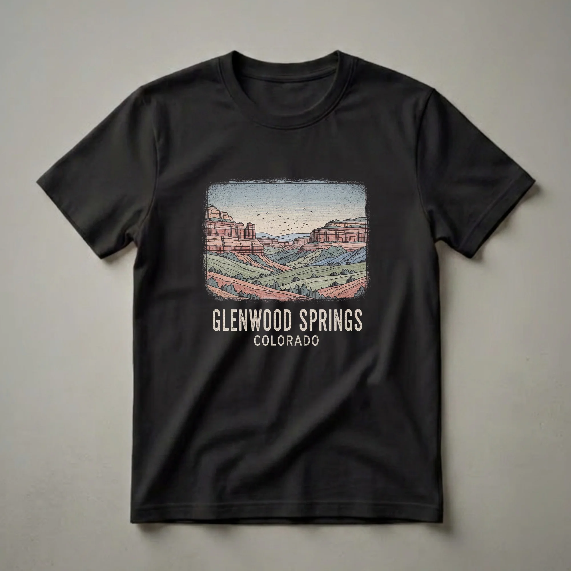 Glenwood Springs, Colorado, is renowned for its dramatic canyons and stunning natural beauty, a landscape captured in this eye-catching graphic tee. The artwork depicts layered rock formations in warm hues, rolling hills covered in green and muted red vegetation, and a vast sky dotted with a flock of birds in flight. This retro-inspired design evokes a sense of adventure and appreciation for the American West. Glenwood Springs is situated in the heart of the Rocky Mountains, known for its hot springs and outdoor recreation opportunities, making this shirt a perfect memento for anyone who has visited or dreams of exploring the area. This t-shirt is a thoughtful gift for travelers, hikers, or anyone who cherishes the unique scenery of Colorado. Wear this shirt to remember your adventures or to inspire your next trip to the mountains. It's a comfortable and stylish way to carry a piece of Colorado with you, whether you're exploring local trails or reminiscing about past journeys. This graphic shirt serves as a conversation starter for fellow enthusiasts of the Mountain West.