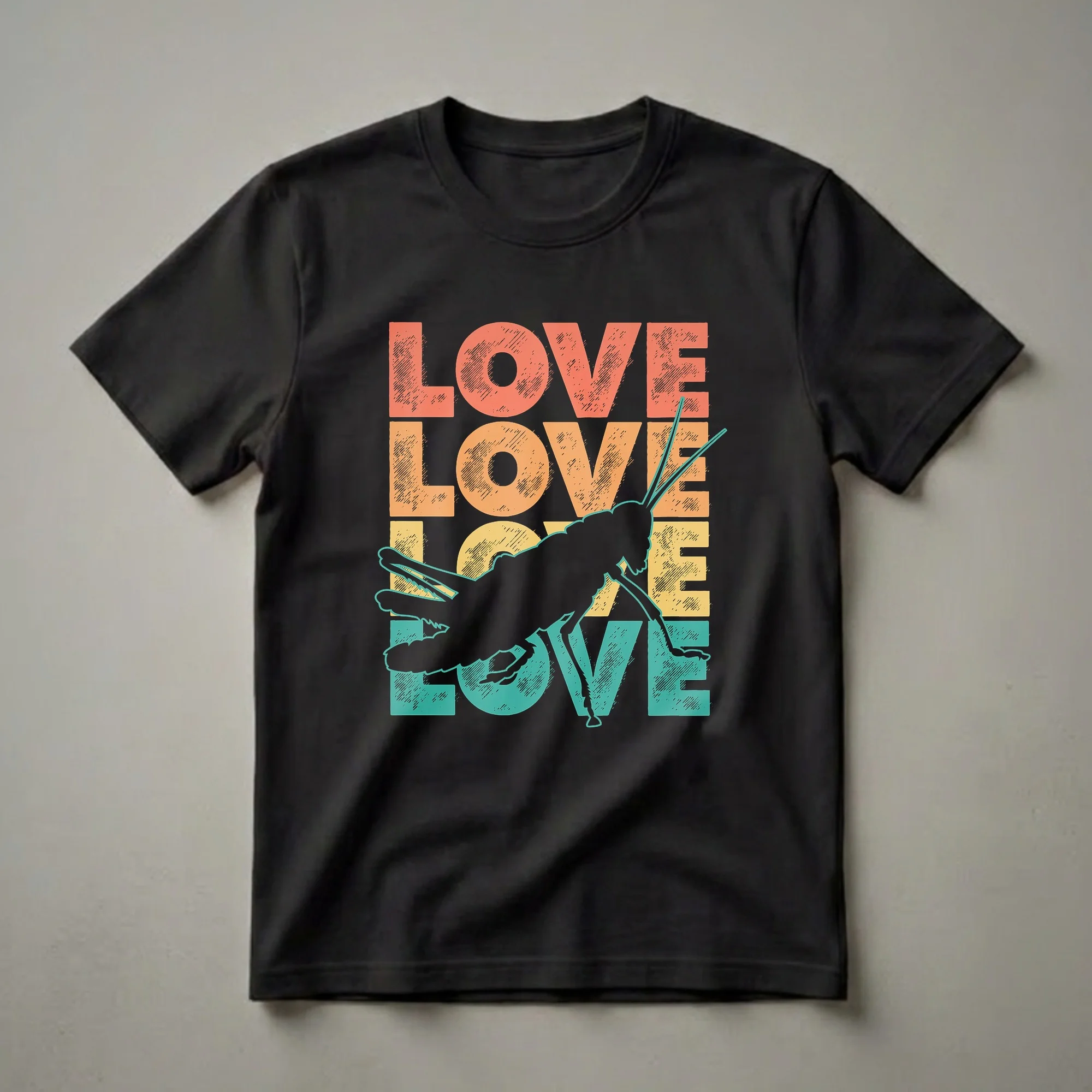 Entomology enthusiasts and backyard naturalists who have a soft spot for grasshoppers will reach for this retro graphic tee. The design stacks LOVE four times in bold distressed lettering, coral red, orange, yellow, teal, with a large grasshopper silhouette outlined in teal overlaid diagonally across the composition, its long hind legs and antennae extending across the full width of the design. Grasshoppers belong to the order Orthoptera and the suborder Caelifera, which includes approximately 11,000 species worldwide. They are distinguished by their powerful hindlegs, capable of propelling them a distance of twenty times their own body length in a single jump, a feat of biomechanics that engineers have studied for decades. Grasshoppers produce sound through stridulation, rubbing their serrated hind legs against their forewings, creating the chirping associated with warm summer evenings. They play a crucial role in ecosystems as both herbivores that cycle nutrients through consumed plant matter and as prey for birds, reptiles, and small mammals. This shirt speaks to nature enthusiasts, field biologists, teachers who bring insects into the classroom, and the rare person who thinks grasshoppers deserve more appreciation than they get. It makes a thoughtful gift for an entomology student, a backyard naturalist, or a child who collects insects and grows up to become a biologist. Wear it to a nature walk, a science fair, or any outdoor gathering.