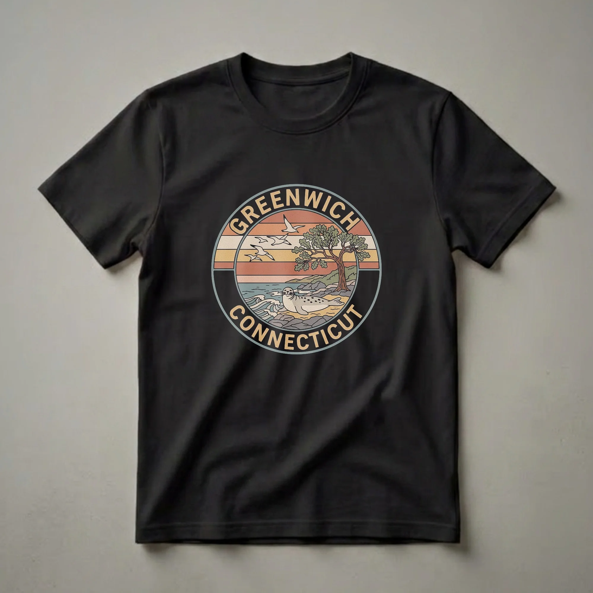 Greenwich, Connecticut residents and visitors who appreciate coastal charm will reach for this unique graphic tee. The design captures a serene moment on the shoreline, featuring a spotted seal lounging on a sandy beach, with gentle waves lapping the rocky coast. Above, seagulls soar against a backdrop of vibrant, retro-style sunset stripes in warm oranges, yellows, and muted blues. A stylized tree with lush green leaves stands on the rocky outcrop, adding to the picturesque scene. This t-shirt is a thoughtful gift for anyone who cherishes memories of the Connecticut coastline or has a fondness for marine wildlife. It's a perfect way to wear your connection to Greenwich, whether you're a local or a visitor reminiscing about your travels. This comfortable tee works well for casual outings, beach days, or simply relaxing at home while dreaming of the sea. The vintage aesthetic makes this shirt a stylish addition to any wardrobe, celebrating the natural beauty of Greenwich.