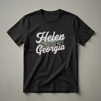 Helen, Georgia residents and visitors who appreciate the unique Bavarian-inspired charm of this mountain town will reach for this retro graphic tee. The design captures the essence of Helen with a picturesque village nestled amongst rolling hills and lush pine forests, reminiscent of the European Alps. A winding river flows through the scene, adding to the tranquil atmosphere. The distinctive architecture, complete with red-tiled roofs and a prominent church steeple, is instantly recognizable to anyone familiar with this popular North Georgia destination. This t-shirt is a thoughtful gift for anyone who has fond memories of visiting Helen, perhaps during its famous Oktoberfest celebrations or a scenic autumn getaway. It serves as a wearable reminder of the town's unique character and its location within the beautiful Blue Ridge Mountains. Wear this shirt to casual outings, exploring local shops, or simply relaxing while reminiscing about your time in this distinctive Georgia town. It’s a staple for anyone wanting to display their connection to Helen.