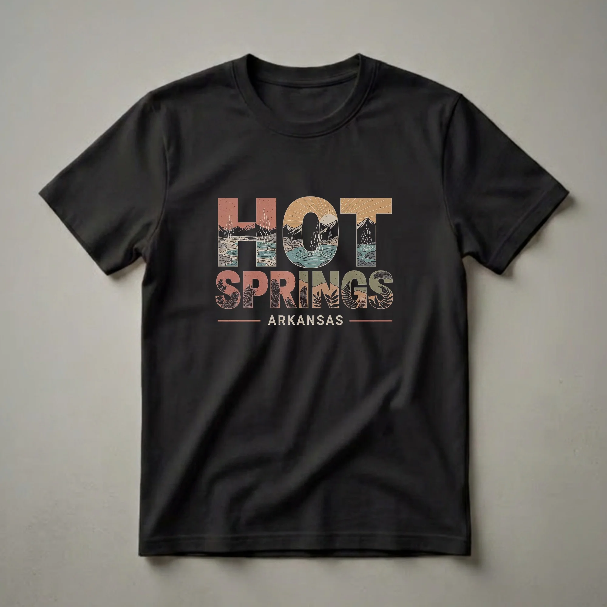 Hot Springs, Arkansas, is a city renowned for its natural thermal springs, nestled within the Ouachita Mountains. This graphic tee captures the essence of this unique destination with a retro-inspired design. The letters of 'HOT SPRINGS' are filled with a stylized landscape, depicting steaming pools of water, rolling hills, and a radiant sun setting behind the mountains. Below, 'ARKANSAS' is presented in a clean, bold font, anchoring the design to its location. The color palette evokes a vintage feel, with earthy tones of rust, muted green, and warm beige, complemented by the deep blues of the water. This shirt is a perfect way for anyone who has visited or dreams of visiting Hot Springs National Park to express their connection to the area. It serves as a reminder of the therapeutic waters and the natural beauty that defines this Arkansas gem. This tee works well for locals proud of their state or for travelers seeking a unique souvenir. It makes a thoughtful gift for anyone who appreciates vintage travel aesthetics and the charm of Arkansas. Wear this shirt to casual outings, while exploring new places, or simply to relax and reminisce about your favorite travel destinations.