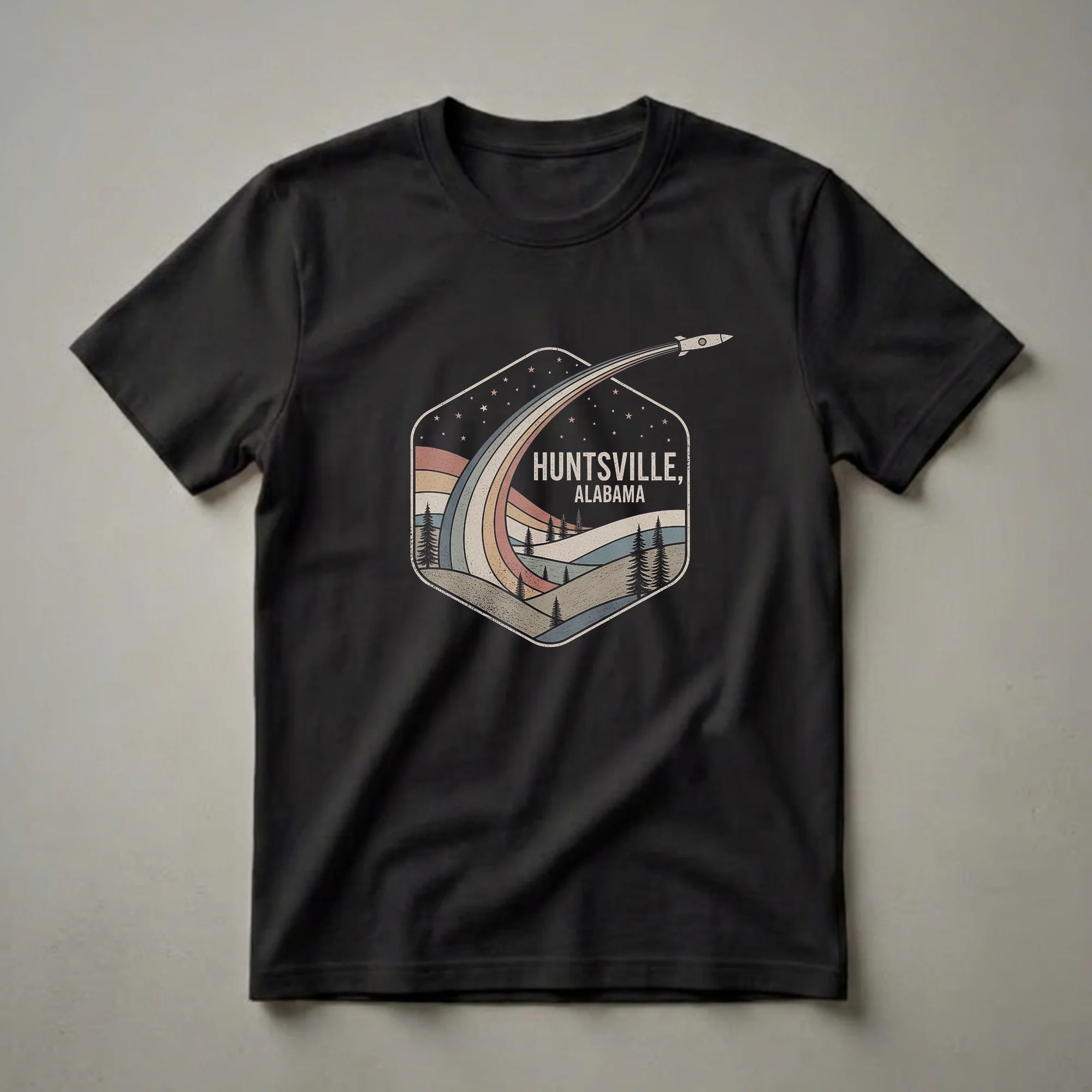 Huntsville, Alabama, a city renowned for its significant contributions to space exploration, is celebrated in this striking retro graphic tee. The design features a hexagonal emblem that encapsulates a vintage-style landscape. Rolling hills in muted, earthy tones are dotted with silhouetted pine trees, creating a sense of depth and natural beauty. Above this serene scene, a vibrant, multi-colored arc, reminiscent of a rainbow or a cosmic trail, sweeps across the night sky. This arc leads the eye to a classic rocket ship, depicted in mid-flight, leaving a trail of stylized smoke or energy. The night sky is sprinkled with small, retro-style stars, enhancing the vintage aesthetic. The words "HUNTSVILLE, ALABAMA" are prominently displayed in a bold, distressed font, anchoring the design to its location. This shirt is a thoughtful gift for anyone who has a connection to Huntsville, whether they are a resident, a former student of the University of Alabama in Huntsville, or a space enthusiast inspired by the city's legacy at the Marshall Space Flight Center. It's a go-to tee for casual outings, visits to local space museums, or simply showing pride in this dynamic Alabama city. Wear it to a local festival or a casual meet-up with friends.