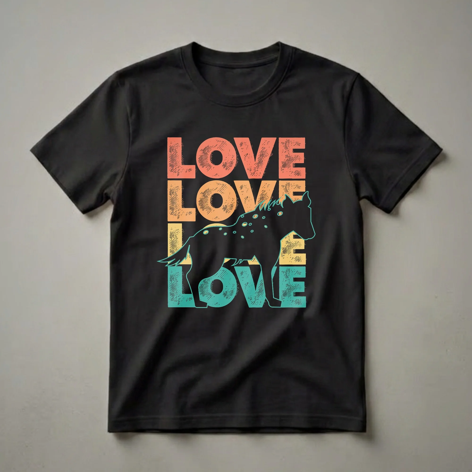 Wildlife fans who want to celebrate one of Africa's most misunderstood predators will reach for this retro sunset graphic tee. The design stacks the word 'LOVE' four times vertically in a warm vintage palette, coral red at the top, followed by orange, then yellow, then teal at the base. Overlaid across the lower rows is a bold black silhouette of a spotted hyena, its characteristic sloped back and raised tail immediately identifiable in profile. Small spots are visible along the animal's flank, confirming the species. The spotted hyena (Crocuta crocuta) is the most common large carnivore in sub-Saharan Africa. Contrary to popular perception, hyenas are highly intelligent, complex social animals that live in matriarchal clans and are capable hunters, not merely scavengers. Their distinctive vocalizations, including the well-known 'laugh,' are used for clan communication over long distances. This tee makes a thoughtful gift for wildlife biologists, safari travelers, zoo enthusiasts, and anyone who admires animals that don't get the appreciation they deserve. Wear it to a natural history museum, a wildlife documentary night with friends, or any casual outing where you want to spark a conversation about African wildlife. Hyena fans who know the real story of this remarkable species will reach for this shirt as a way to represent.