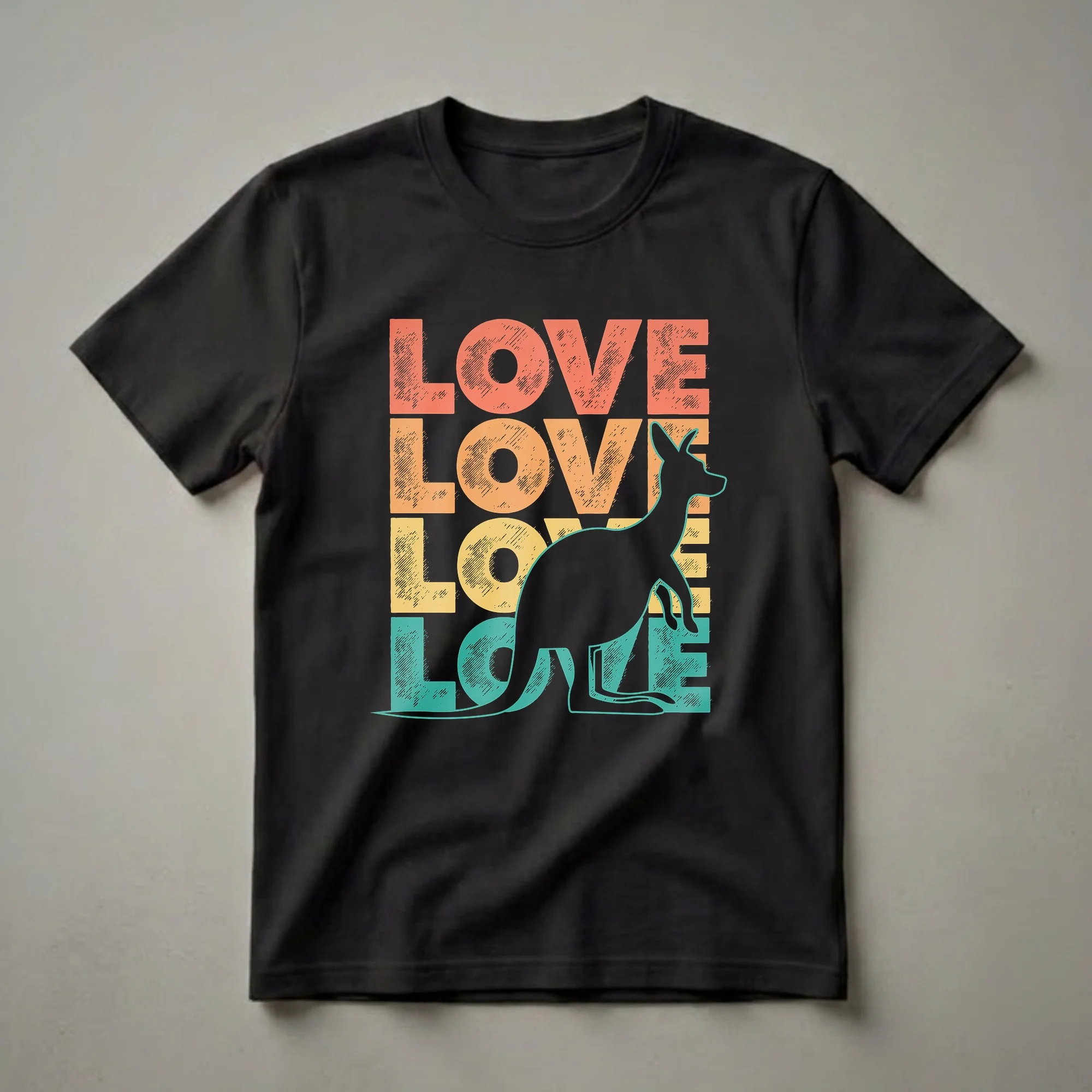 Kangaroo enthusiasts and Australian wildlife fans who want their favorite marsupial on their wardrobe will reach for this retro graphic tee. The design stacks LOVE four times in bold distressed lettering, coral red, orange, yellow, teal, covering the chest in warm vintage color. A large black kangaroo silhouette with a teal outline is overlaid across the middle rows, the animal shown in a characteristic at-rest pose with its tail grounded, body upright, and ears alert. Kangaroos are marsupials native to Australia, where four living species inhabit environments ranging from the arid outback to tropical rainforests. The eastern grey kangaroo (Macropus giganteus) is the most commonly seen species along Australia's east coast. Kangaroos are social animals that live in groups called mobs, typically led by a dominant male. Their powerful hind legs are built for high-speed hopping and can deliver a forceful kick when defending against predators, dingoes and eagles among them. Joeys are born at a very early developmental stage, roughly the size of a jellybean, and complete their development inside the mother's pouch over several months. This shirt works well for anyone who has visited Australia, watched wildlife documentaries, or simply developed a genuine attachment to these unusual animals. It makes a thoughtful gift for a wildlife lover, a traveler, or a student who just finished a unit on marsupials. Wear it to the zoo, a nature outing, or a casual day that deserves a conversation starter.