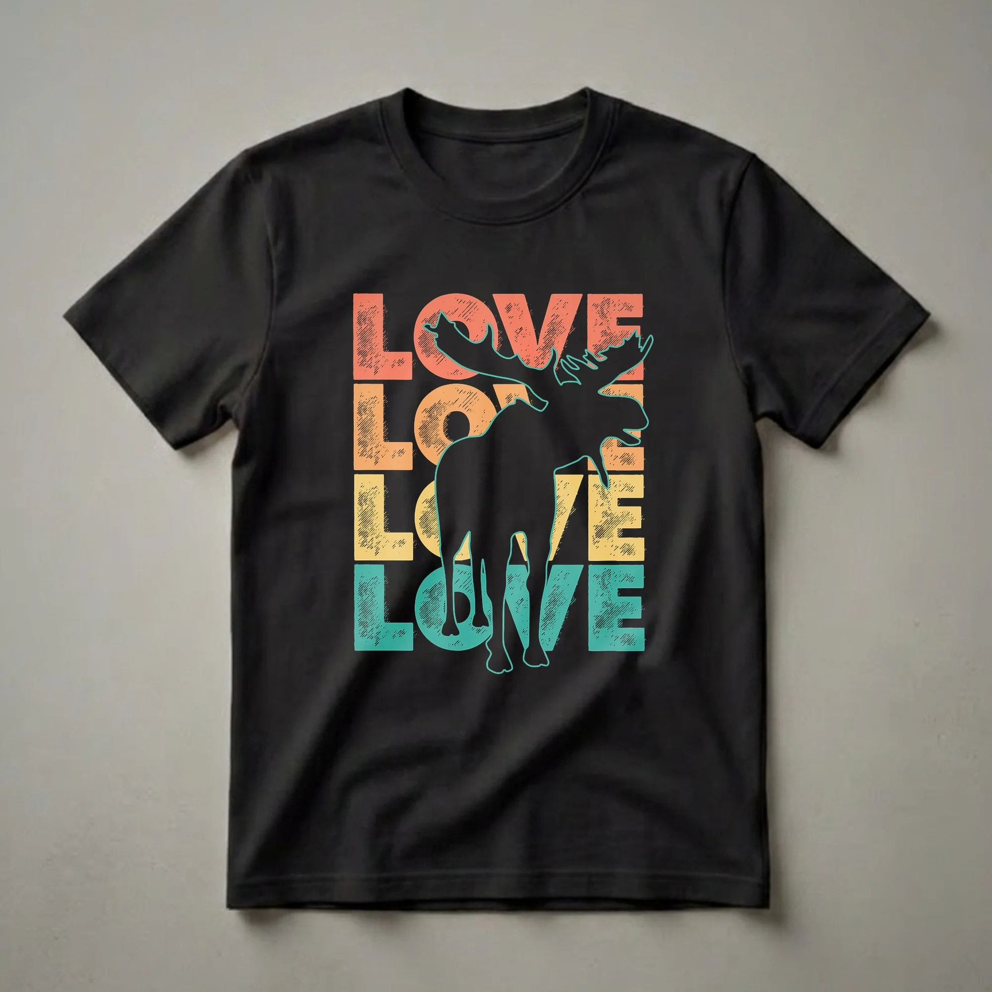 Wildlife enthusiasts and outdoors people who have a particular appreciation for the largest member of the deer family will reach for this retro graphic tee. The design stacks LOVE four times in bold distressed lettering, coral red, orange, yellow, teal, and places a large black moose silhouette with a teal outline over the composition. The moose's trademark feature, a wide, palmate rack of antlers, extends above the top row of lettering, immediately communicating what animal this is without any text required. The moose (Alces alces) is the largest living cervid, with adult bulls reaching 1,500 pounds and antler spans exceeding six feet. In North America it is found across Canada and the northern United States, particularly in Alaska, Minnesota, Maine, and the Rocky Mountain states. The closely related European moose, also called elk (Alces alces europaeus), ranges across Scandinavia, Russia, and into Central Asia. Despite their size, moose are strong swimmers, capable of submerging entirely to feed on aquatic plants, and can run at speeds of 35 miles per hour. Moose are solitary animals, coming together only during the autumn rut when bulls compete vocally and physically for access to females. This shirt works well for hunters, hikers, wildlife photographers, and anyone who has encountered a moose on a trail and understood immediately what it means to feel genuinely small in the natural world. It makes a thoughtful gift for a wildlife lover, a cabin-country regular, or an elk hunter who also appreciates their moose cousins.