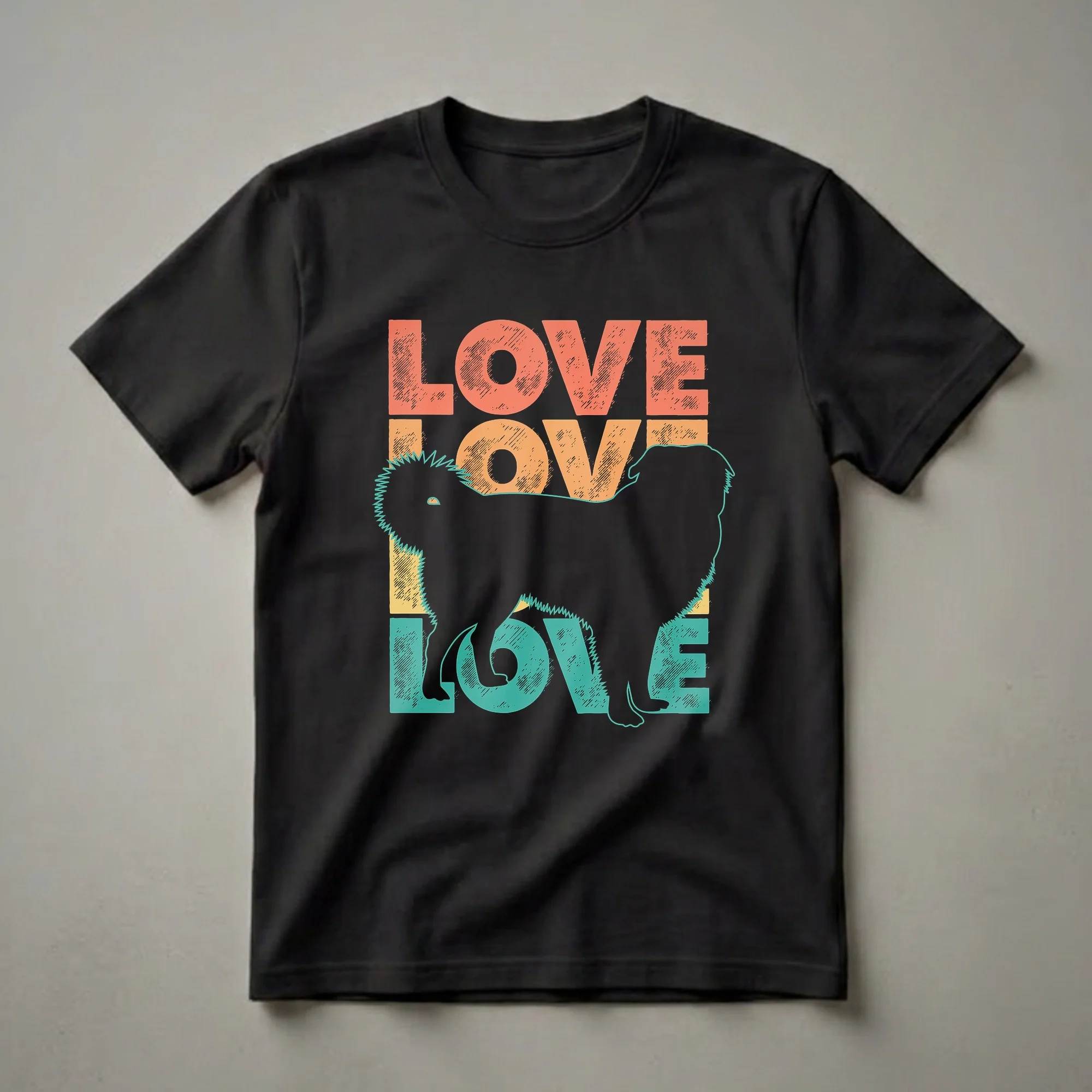 - Features a retro 'LOVE' word design with a striking Australian Shepherd silhouette.
