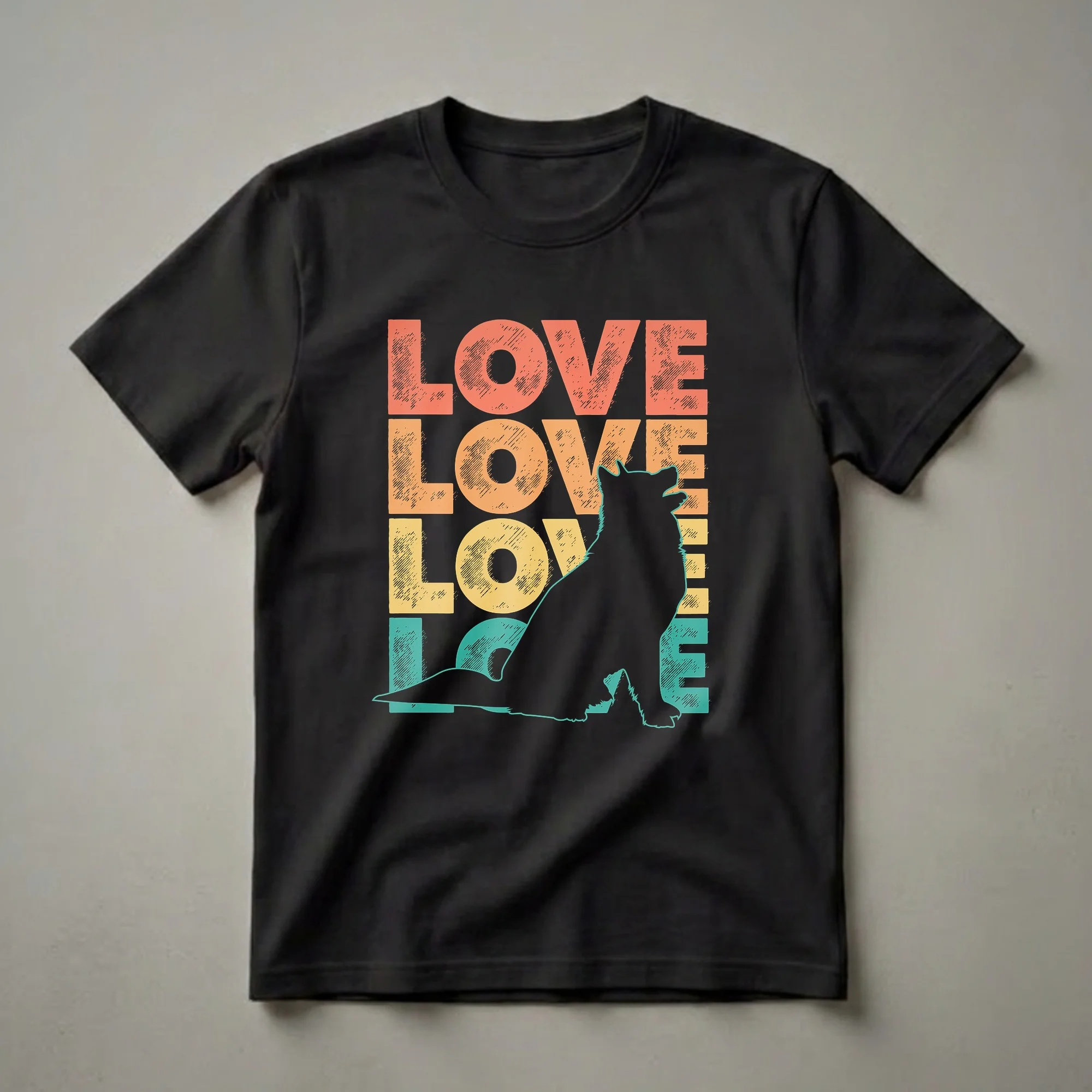 Siberian Husky owners know the breed's striking blue eyes and their incredible endurance, often used for sled pulling in their native Arctic regions. This retro-inspired graphic tee features the word 'LOVE' stacked vertically in a distressed, vintage font, with each word in a different color: coral, orange, yellow, and teal. Overlapping the bottom two 'LOVE's is a bold black silhouette of a Siberian Husky, sitting attentively with its head turned slightly. The silhouette's outline is a contrasting teal, adding a pop of color to the dark canine form. This shirt is a thoughtful gift for any woman or man who cherishes their Siberian Husky, making it a go-to tee for casual outings or relaxing at home. It's a fantastic way for dog moms and dog dads to express their affection for their four-legged family members. Wear this t-shirt to the dog park or while running errands to showcase your passion for this majestic breed.