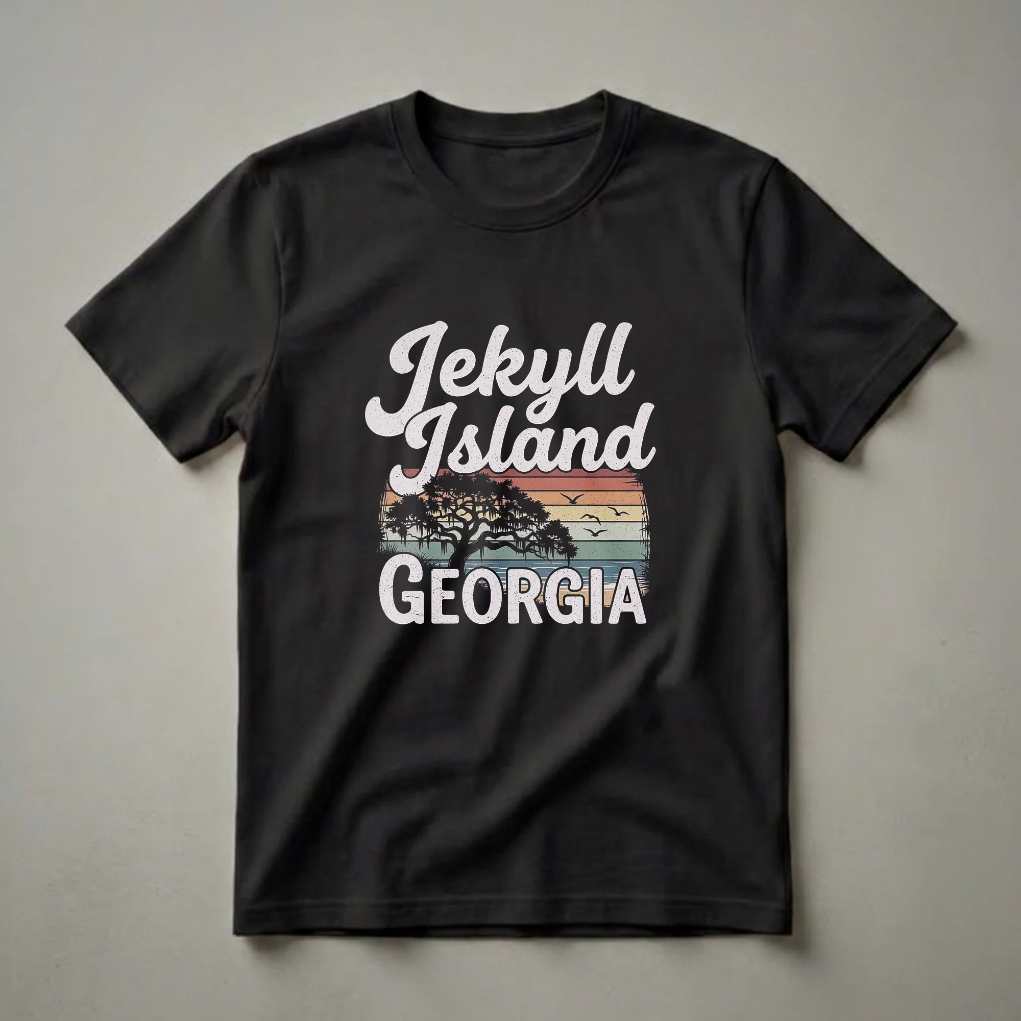 Jekyll Island, Georgia, is a popular destination known for its natural beauty and coastal charm. This graphic tee captures that essence with a retro-inspired design. The artwork features the words "Jekyll Island" in a stylized script across the top, with "GEORGIA" boldly displayed below. A vintage sunset with horizontal stripes in warm tones forms the backdrop, while a silhouette of a classic live oak tree draped with Spanish moss stands prominently. Three seagulls fly across the sky, adding to the coastal atmosphere. This t-shirt is a thoughtful gift for anyone who has visited or dreams of visiting this beautiful Georgia barrier island. It's a great way for residents or vacationers to commemorate their time spent exploring the beaches, historic sites, and marshes of Jekyll Island. Wear this shirt to remember your Georgia coast adventures or to inspire your next trip. This tee works well for anyone who appreciates vintage travel designs and coastal scenery. It's a staple for your vacation wardrobe or a unique souvenir to bring home.