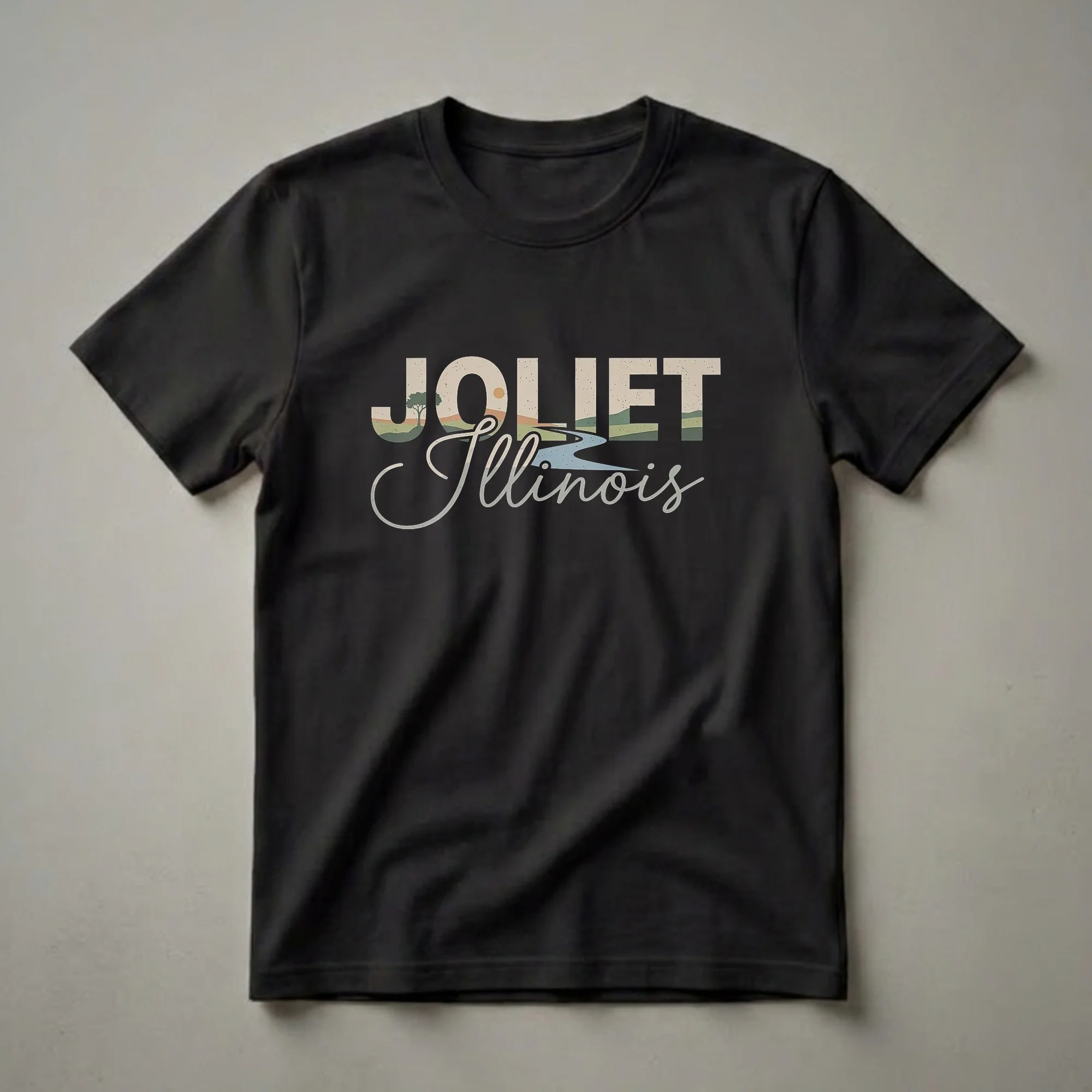 Joliet, Illinois residents and visitors who appreciate vintage-inspired designs will reach for this unique graphic tee. The design features the word "JOLIET" in large, distressed block letters, with a stylized retro landscape filling the negative space. A winding blue river flows through rolling green hills and a warm, setting sun peeks over the horizon, all beneath a single, silhouetted tree. Below "JOLIET," the word "Illinois" is written in a flowing, script font, adding a touch of classic elegance. Joliet, situated along the Des Plaines River, is a significant city in Will County, known for its historical role in transportation and industry. This shirt serves as a wearable piece of local identity, a thoughtful choice for anyone who calls Joliet home or has fond memories of the area. It makes a thoughtful gift for friends or family who have a connection to this Illinois city. Wear this comfortable tee to local events, casual outings, or while exploring the charming streets of Joliet, celebrating your Illinois roots with pride. This t-shirt is a staple for any wardrobe representing the heart of the Midwest.