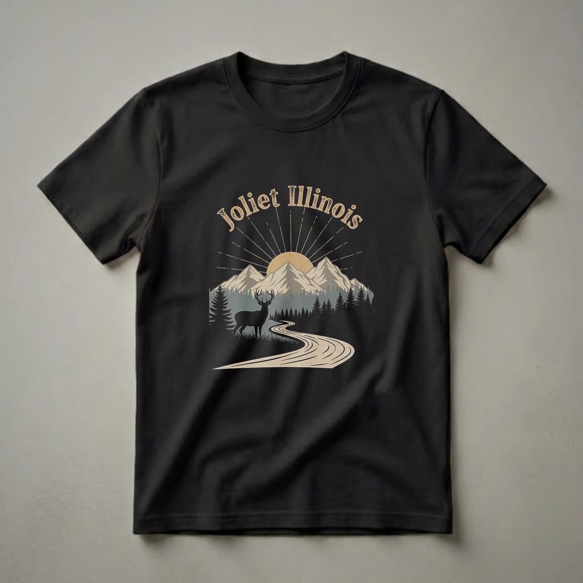 Joliet, Illinois residents and visitors who appreciate the natural beauty of the region will reach for this unique graphic tee. The design captures a serene wilderness scene, featuring a majestic deer standing in tall grass, silhouetted against a backdrop of pine trees and rugged mountains. A stylized sunburst rises behind the peaks, casting a warm glow over the landscape, while a winding road leads the eye into the distance. This shirt celebrates the spirit of adventure and the outdoors, evoking the feeling of exploring scenic routes and natural vistas. Illinois, though known for its flat terrain in many areas, has pockets of surprising natural beauty, and this design brings that spirit to life. It's a thoughtful gift for anyone who calls Joliet home or has fond memories of visiting the area. Wear this t-shirt on your next outdoor excursion, a casual day out, or to a local gathering to showcase your connection to Joliet. This apparel is a staple for those who love vintage-inspired nature graphics and want to represent their hometown with pride. The graphic tee offers a comfortable and stylish way to express your appreciation for the scenic elements that make Joliet special.