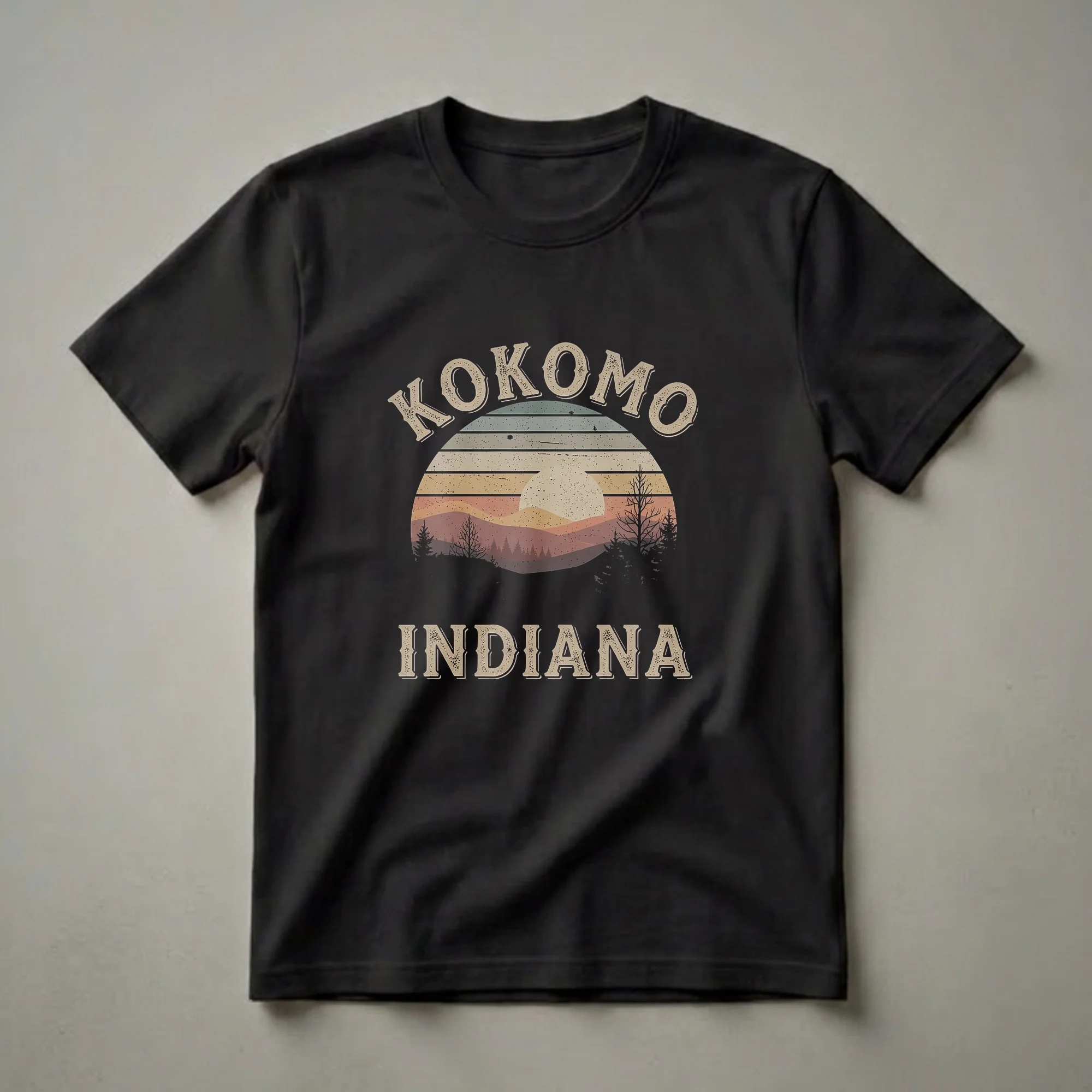 - Features a vintage sunset landscape design with 'KOKOMO INDIANA' text.