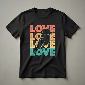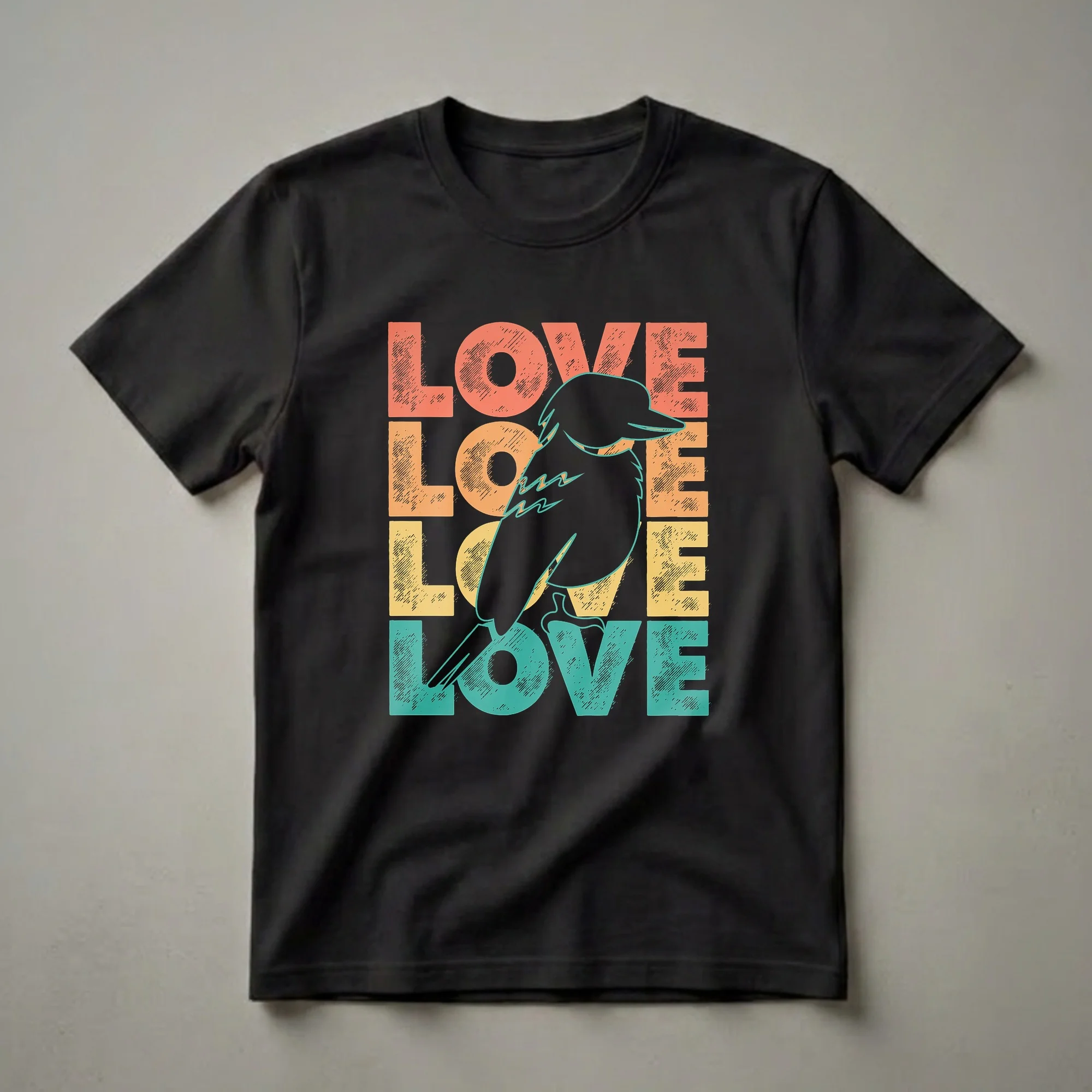 Kookaburra enthusiasts who appreciate unique avian art will reach for this striking graphic tee. The design showcases a bold, black silhouette of a kookaburra perched on a branch, set against a retro-style stacked text graphic that spells out 'LOVE'. Each letter is rendered in a distressed, vintage aesthetic with a color palette featuring coral, orange, yellow, and teal, evoking a tropical sunset vibe. Kookaburras, native to Australia, are known for their distinctive call, often described as sounding like human laughter, and are the largest members of the kingfisher family. This shirt is a thoughtful gift for any bird watcher, ornithologist, or someone who simply admires these fascinating Australian birds. It's a great conversation starter for casual outings, nature walks, or simply relaxing at home. This t-shirt offers a stylish way for bird lovers to express their passion for wildlife and unique graphic designs. Wear it to your next bird-watching expedition or casual gathering.