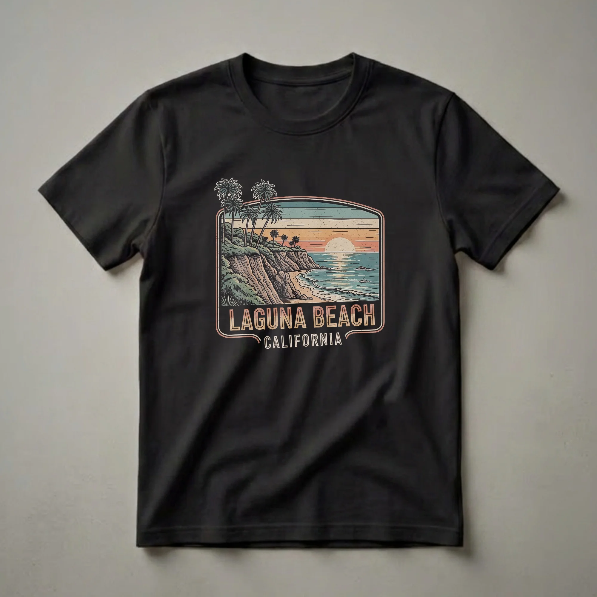 Laguna Beach, California, is renowned for its stunning coastline and vibrant artistic community, a scene beautifully captured in this retro-inspired graphic tee. The artwork depicts a dramatic cliffside overlooking the Pacific Ocean, bathed in the warm hues of a setting sun. Palm trees sway gently against a sky painted with bands of orange, pink, and teal, reflecting on the tranquil water. Waves softly lap against the sandy shore, inviting you to imagine the ocean breeze. This t-shirt is a tribute to the iconic Southern California beach town, appealing to those who cherish its natural beauty and laid-back atmosphere. It's a staple in the collection for anyone who dreams of the California coast or has fond memories of visiting this picturesque location. This shirt works well for beachgoers, surfers, or anyone who appreciates vintage travel art. It makes a thoughtful gift for a friend or family member planning a trip to Orange County or looking to bring a piece of the California dream home. Wear this tee to a casual outing, a beach bonfire, or simply when you want to feel the coastal spirit.