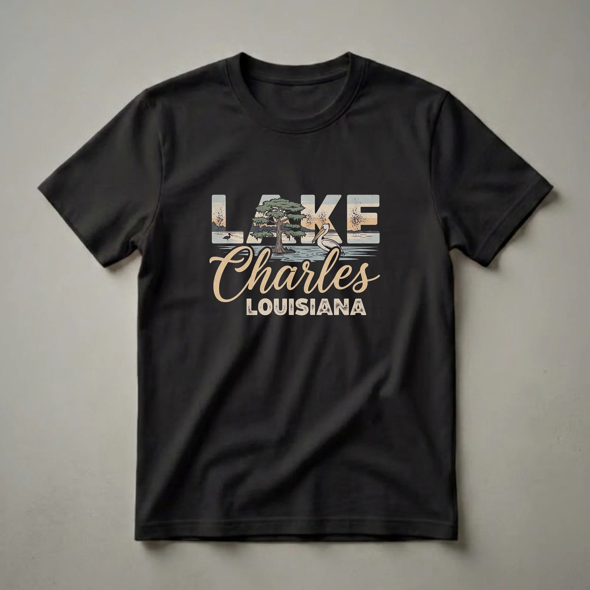- Retro graphic t-shirt showcasing Lake Charles, Louisiana's iconic pelican and waterfront.