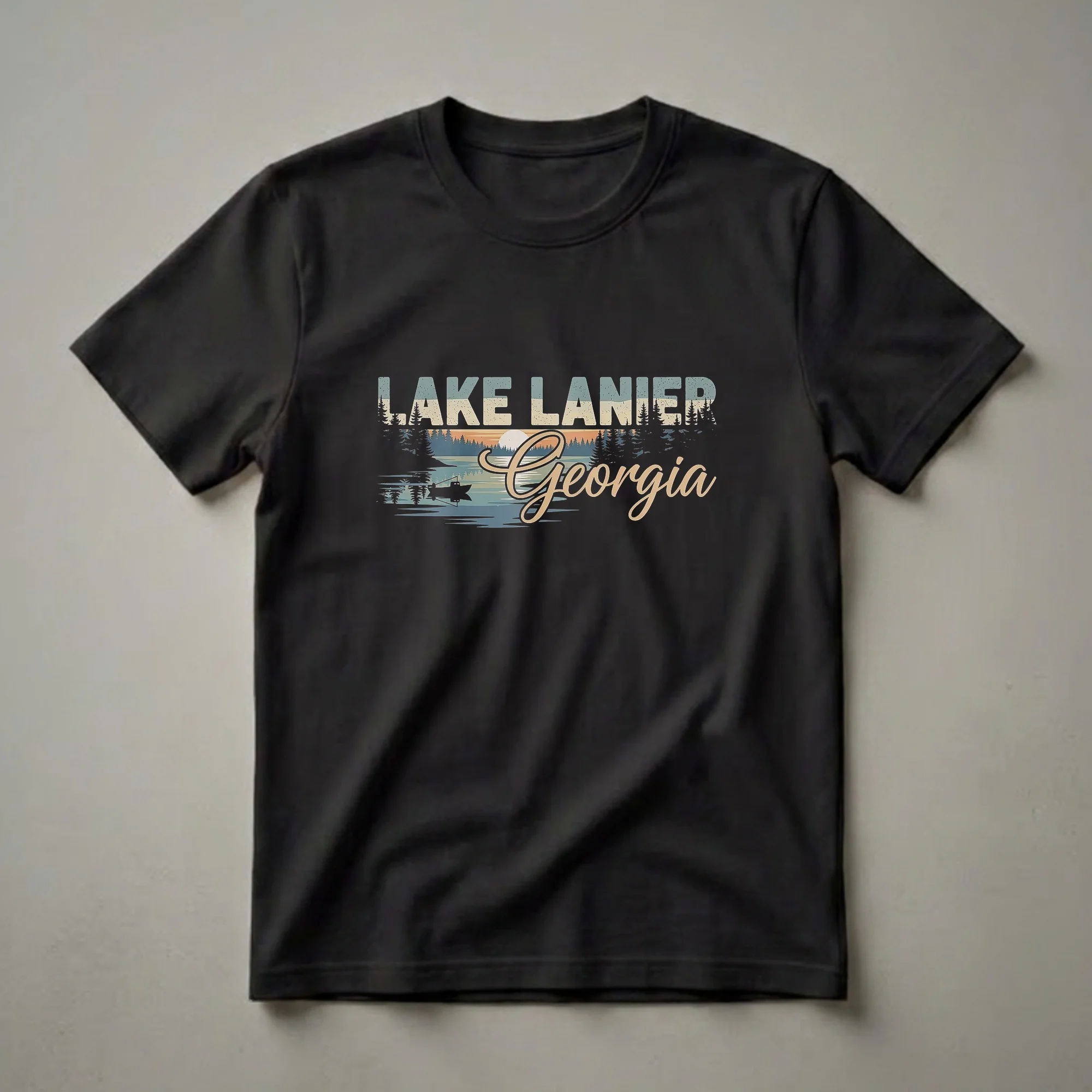Lake Lanier residents and visitors who appreciate the beauty of Georgia's popular reservoir will reach for this retro-inspired graphic tee. The design features a serene sunset scene over the water, complete with silhouetted pine trees lining the shore and a lone fishing boat casting a reflection. The words "LAKE LANIER" are emblazoned across the top in a distressed, block-style font, while "Georgia" is written in a flowing, script font below. Lake Lanier, located in northern Georgia, is a major recreational destination, known for its clear waters and extensive shoreline, making it a prime spot for boating, swimming, and fishing. This shirt captures the nostalgic feel of a perfect day spent on the lake. It makes a thoughtful gift for anyone who cherishes memories of Georgia's natural beauty or enjoys a peaceful day of angling. Wear this t-shirt to your next fishing trip, a casual outing with friends, or while reminiscing about your favorite Georgia adventures. It's a comfortable and stylish way to represent your connection to Lake Lanier.