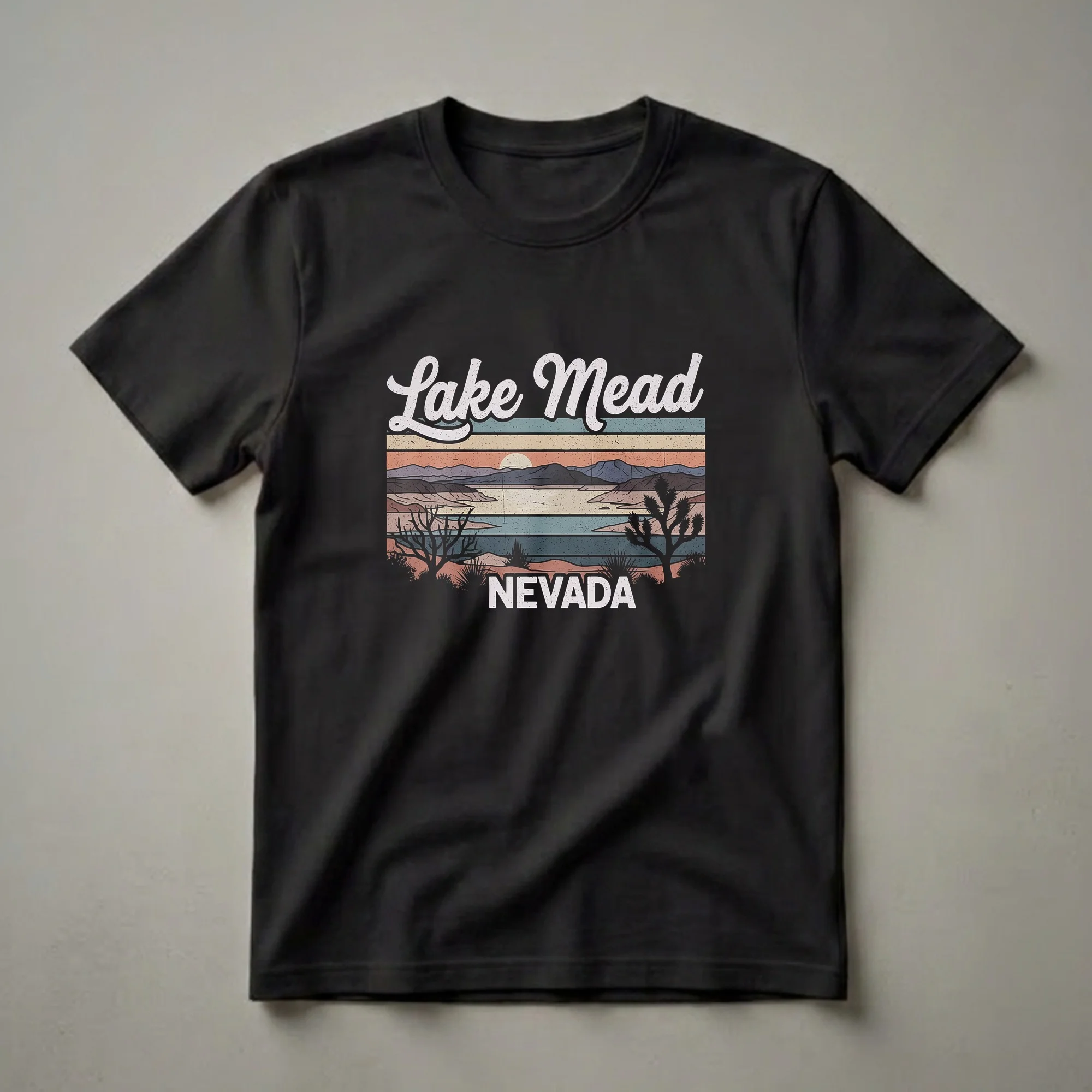Lake Mead, a vast reservoir on the Colorado River, straddling the Nevada and Arizona border, is depicted in this retro-inspired graphic tee. The design showcases a stylized sunset over the water, with silhouetted mountains in the background and iconic desert flora like Joshua trees in the foreground. This shirt is for anyone who has visited Lake Mead National Recreation Area and cherishes the memories of its unique desert landscape and expansive waters. It's a thoughtful gift for travelers who appreciate vintage aesthetics and want to commemorate their trips to Nevada. Wear this t-shirt on your next outdoor adventure or casual outing to showcase your love for this iconic American landmark. The design evokes a sense of nostalgia for classic travel posters and the golden age of road trips, making it a unique addition to any wardrobe. Whether you're a local Nevadan or a visitor, this tee serves as a wearable memento of the beauty found in the desert Southwest. It’s a staple for those who love exploring national parks and scenic destinations.