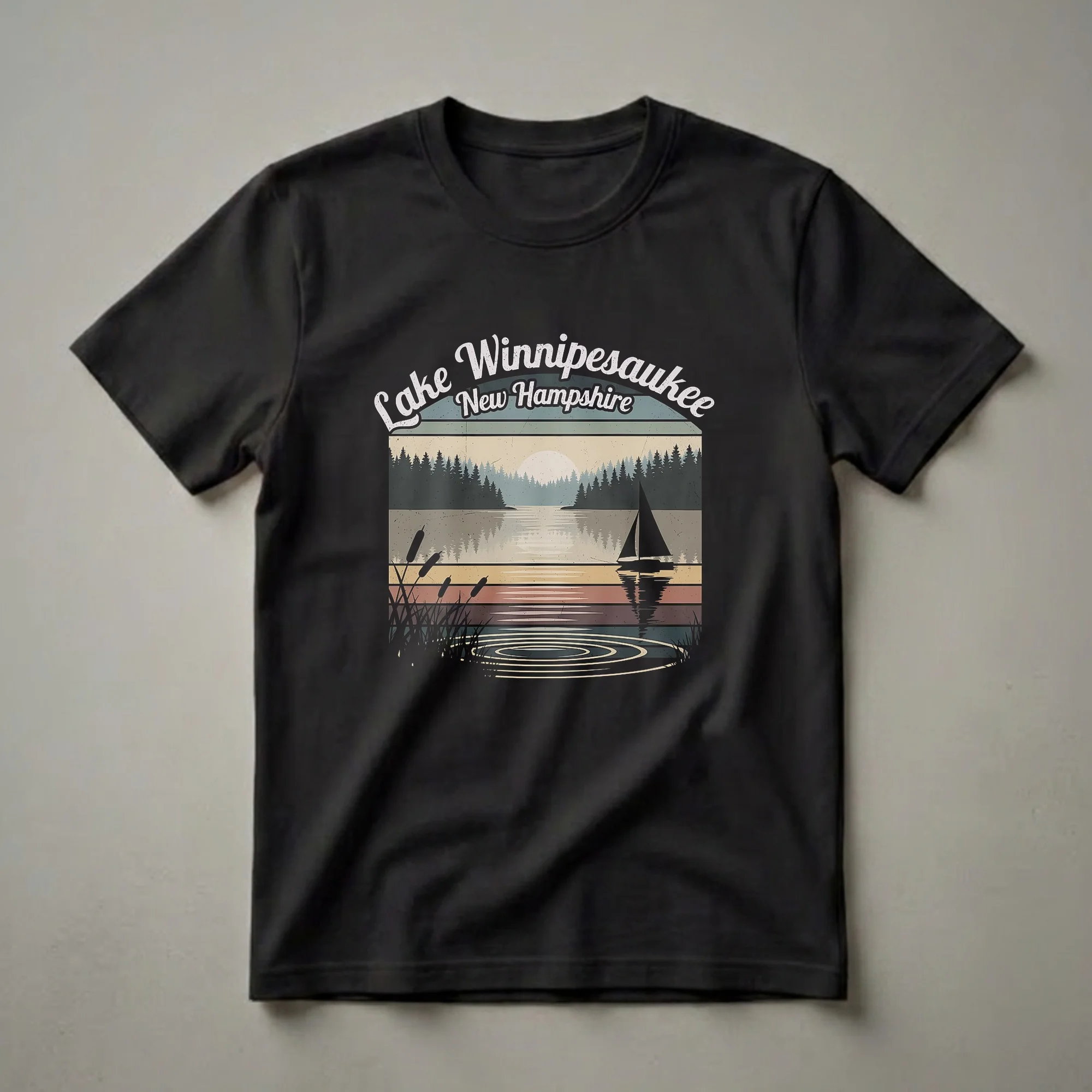 - Retro Lake Winnipesaukee New Hampshire graphic t-shirt for lake enthusiasts.