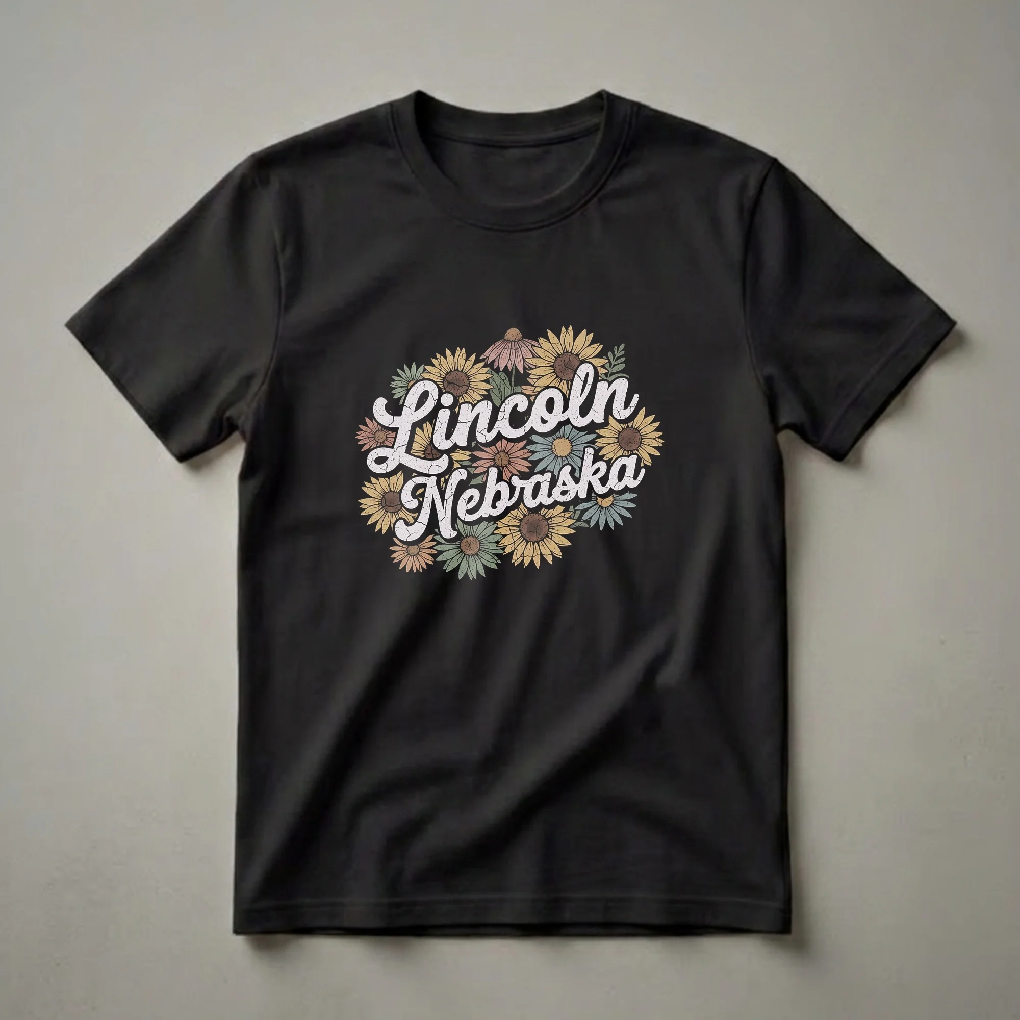 - Features a distressed 'Lincoln Nebraska' lettering with a vintage floral motif.