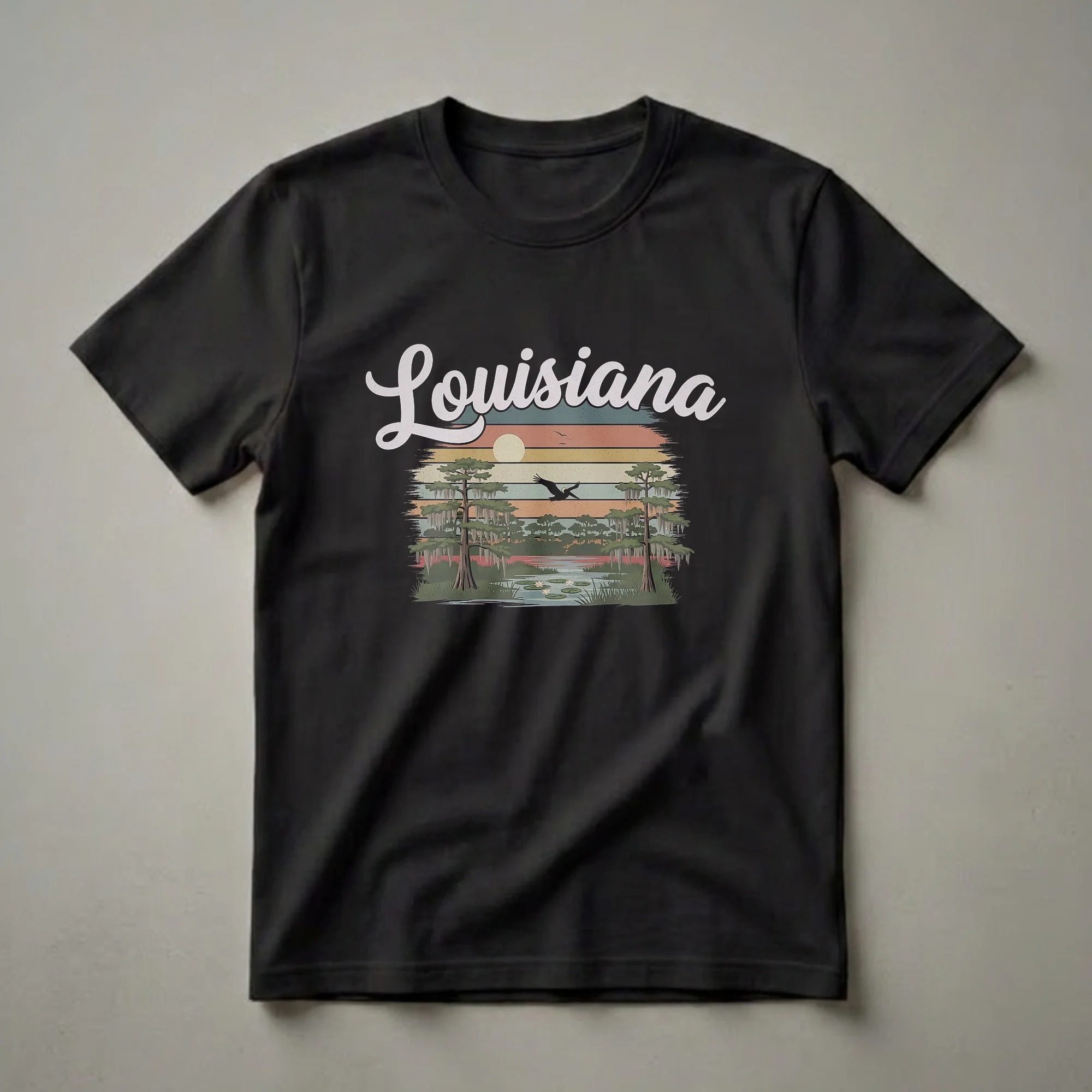 Louisiana residents and admirers of the Bayou State will reach for this unique graphic tee. The design captures the essence of Louisiana's distinctive landscape, featuring iconic cypress trees draped with Spanish moss, a tranquil bayou with water lilies, and a silhouette of a pelican in flight against a vintage-inspired sunset. This shirt is a nod to the natural beauty found throughout the state, from the Atchafalaya Basin to the coastal marshes. The retro color palette, with its muted oranges, greens, and blues, evokes a sense of nostalgia and timeless appeal. This t-shirt works well for casual outings, expressing state pride, or as a thoughtful gift for someone who has a special connection to Louisiana. Imagine wearing this comfortable tee while exploring the historic streets of New Orleans or enjoying a quiet afternoon by the water. It's a staple in the collection for anyone who appreciates the unique charm and natural wonders of Louisiana, making it a go-to tee for everyday wear.