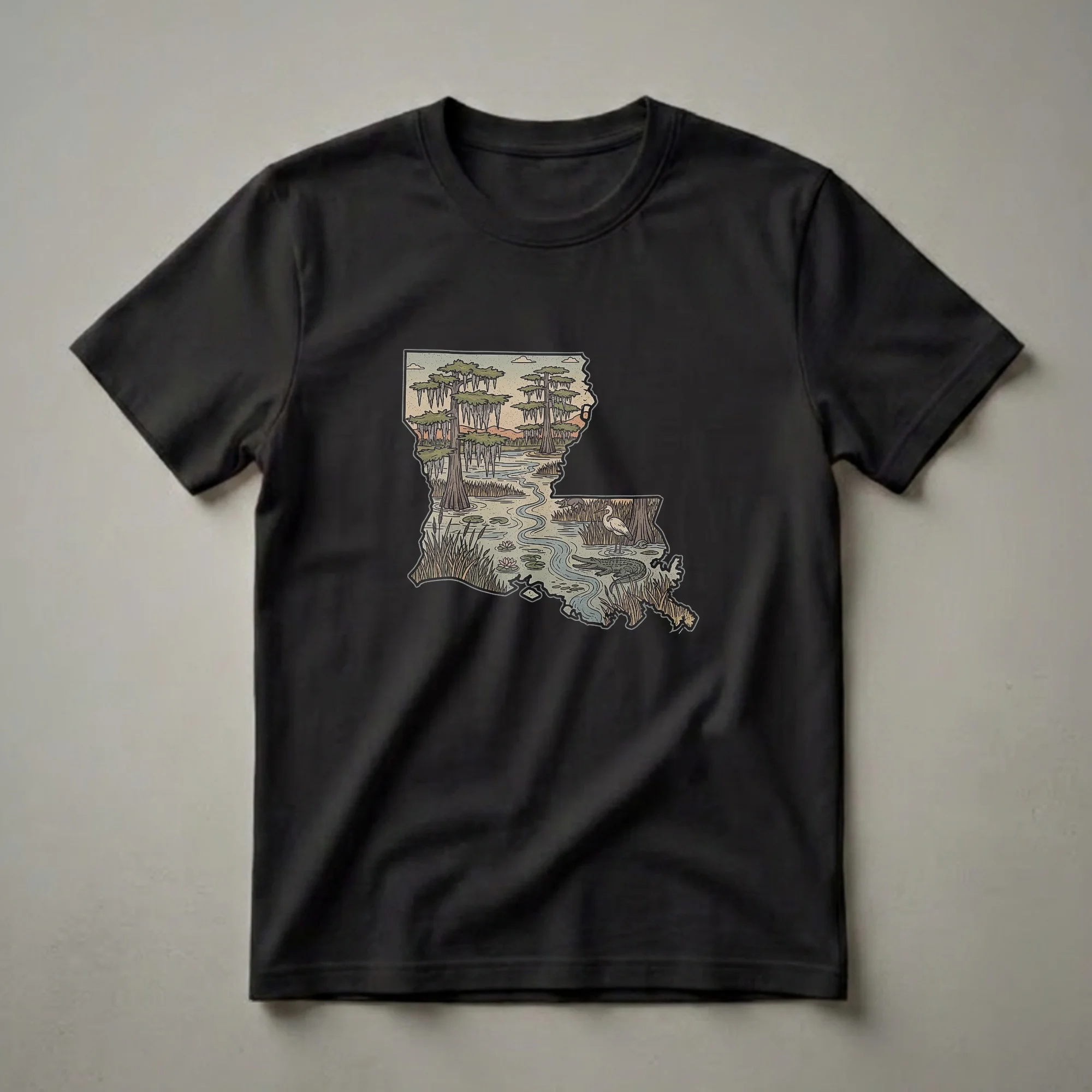 Louisiana's rich natural beauty is captured in this striking graphic tee, rendered in a vintage art style. The design is shaped like the state itself, depicting a vibrant swamp ecosystem. Majestic cypress trees draped with Spanish moss dominate the landscape, their roots submerged in the murky water. A winding river flows through the scene, reflecting the muted tones of the sky and surrounding reeds. Lily pads float serenely on the water's surface, hinting at the hidden life beneath. Prominently featured are an American alligator, a symbol of the state's wild heart, and a graceful white egret, adding to the authentic marshland ambiance. This t-shirt is a tribute to the unique bayou environment that defines Louisiana. It's a go-to tee for anyone who cherishes the state's distinctive natural heritage, from its diverse wildlife to its iconic flora. This shirt makes a thoughtful gift for Louisianans, nature photographers, or anyone who appreciates the beauty of wetlands and the creatures that inhabit them. Wear it to explore the state's natural parks or simply to carry a piece of Louisiana's wild spirit with you.