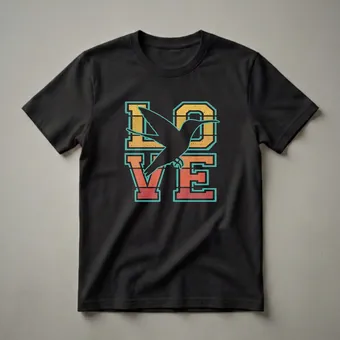 Bird watchers and hummingbird enthusiasts will appreciate this eye-catching graphic tee. The design features the word 'LOVE' in a bold, retro font with a distressed texture, reminiscent of vintage travel posters. Superimposed over the letters is the silhouette of a hummingbird in mid-flight, its wings outstretched. The word 'LOVE' is filled with horizontal stripes in a sunset palette of warm oranges, yellows, and reds, outlined in a cool teal. Hummingbirds are known for their incredible speed and agility, often hovering in place to feed on nectar. This shirt is a thoughtful gift for anyone who cherishes these tiny, vibrant creatures. It makes a thoughtful gift for bird watchers and nature enthusiasts. Wear this t-shirt to your local park or nature reserve to showcase your passion for avian life. This unique shirt is a staple for any bird lover's wardrobe, offering a stylish nod to their favorite feathered friends. It's a go-to tee for expressing a deep affection for these fascinating birds.