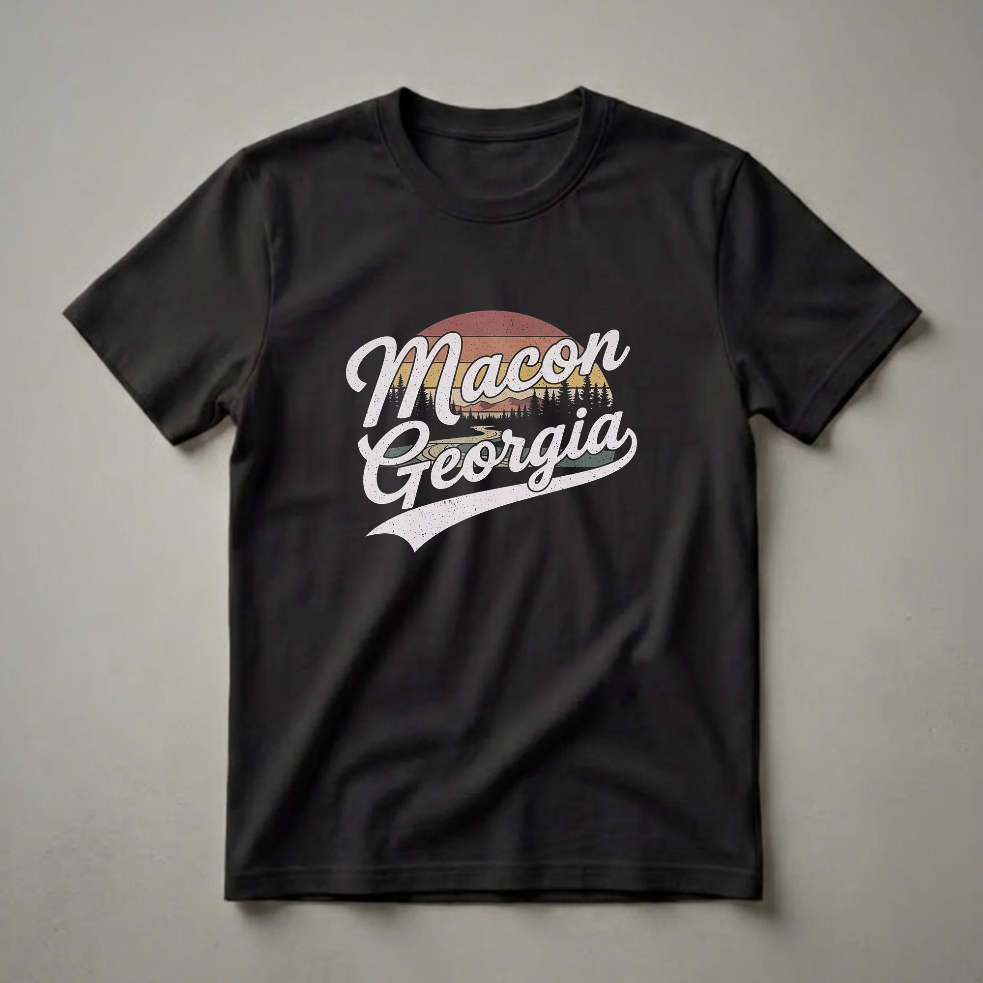 - Macon Georgia graphic tee featuring a bold retro script and scenic sunset design.