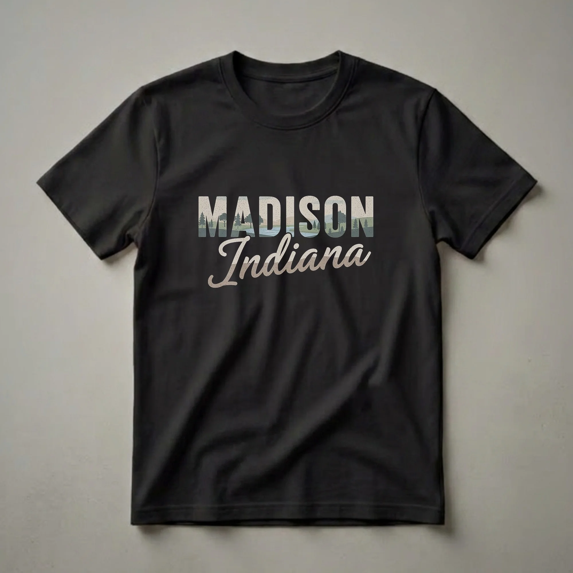 Madison, Indiana residents and fans of the Hoosier State will appreciate this retro-inspired graphic tee. The design features the words "MADISON Indiana" in a distressed, vintage style. Within the letters, a serene landscape unfolds, showcasing rolling hills, evergreen trees, and a winding river, evoking the natural beauty of the region. Madison, situated along the Ohio River, is known for its historic charm and scenic vistas, making this shirt a perfect way to represent your hometown pride. This t-shirt works well for anyone who has lived in or visited Madison and cherishes its unique character. It makes a thoughtful gift for friends, family, or anyone with a connection to this picturesque Indiana town. Wear this shirt to casual outings, local events, or simply as a comfortable everyday staple that celebrates your Indiana roots. The graphic tee offers a stylish nod to the Midwest's natural appeal and the specific charm of Madison.