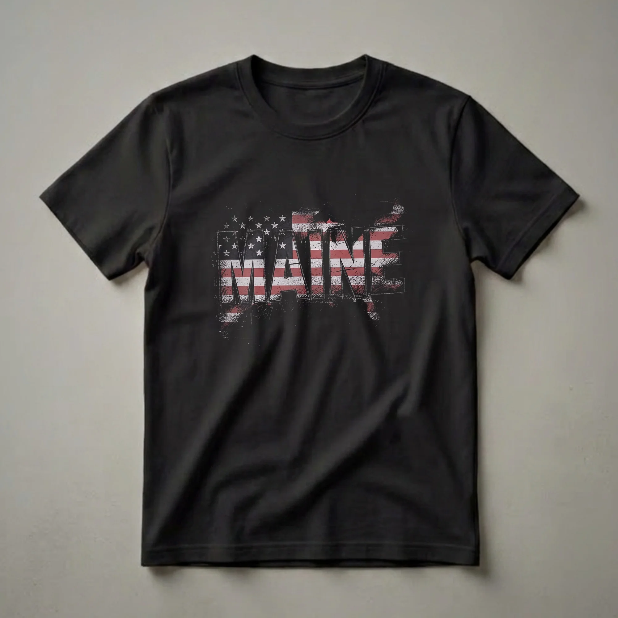- Features a distressed American flag design within the word MAINE.