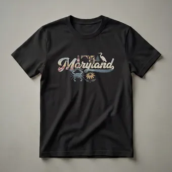 Maryland residents and visitors who appreciate the state's unique charm will reach for this retro graphic tee. The design prominently features the word 'Maryland' in a distressed, vintage font. Integrated within the lettering and surrounding it are iconic symbols that represent the Old Line State. You can spot a classic lighthouse, reminiscent of those found along the Chesapeake Bay, and a majestic blue crab, a culinary and cultural staple. A great blue heron stands tall, a common sight in Maryland's diverse wetlands, alongside a pine tree and a black-eyed Susan, the state flower. The Maryland state flag is also subtly incorporated into the design. This shirt is a thoughtful gift for anyone who holds Maryland dear, whether they are a lifelong resident, a proud expat, or a traveler who cherishes memories of the state's natural beauty and rich heritage. Wear it to casual outings, while exploring coastal towns, or to family gatherings to spark conversations about your favorite state.