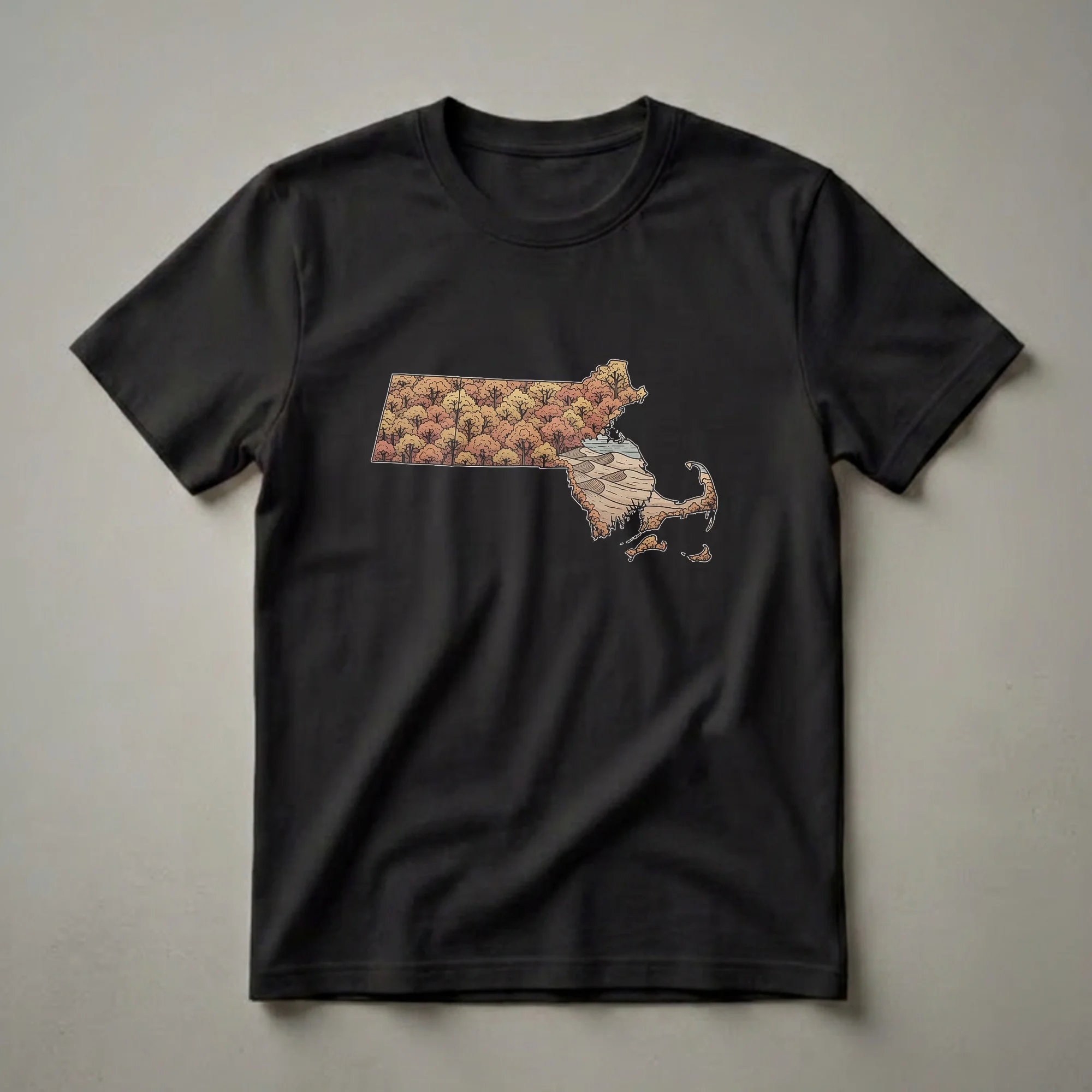 - Massachusetts autumn forest and coastline map art graphic tee.
