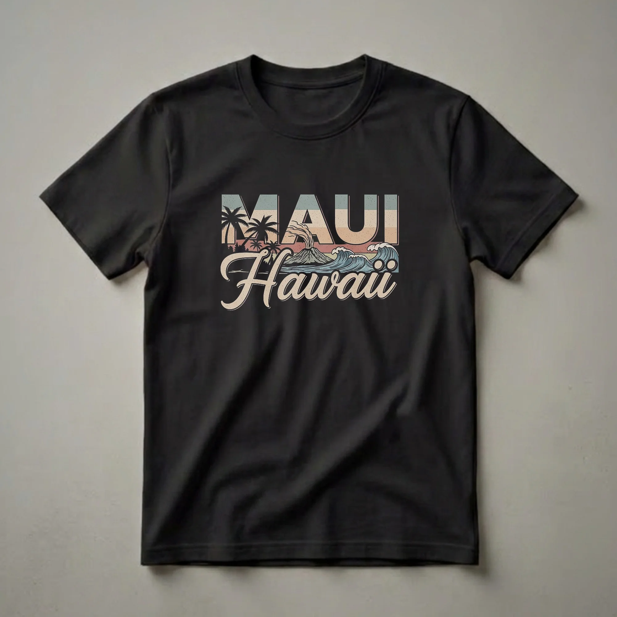Maui, the Valley Isle, beckons with its stunning landscapes and vibrant culture, and this graphic tee captures that essence. The design prominently features the word 'Maui' in bold, retro-style lettering, layered over a muted, striped background of teal, tan, and coral. Below, the word 'Hawaii' is written in a flowing script. The artwork depicts a classic Hawaiian scene: silhouetted palm trees frame a smoking volcano, representing the island's volcanic origins, while dynamic waves crash on the shore, symbolizing the powerful Pacific Ocean. This shirt is a thoughtful gift for anyone who has visited Maui or dreams of experiencing its unique charm. It's a staple for those who appreciate vintage travel aesthetics and want to carry a piece of the islands with them. Wear this tee to casual outings, beach days, or while reminiscing about your Hawaiian adventures. The retro color palette and iconic imagery make this t-shirt a standout piece for island enthusiasts and travelers alike, offering a nostalgic nod to classic Hawaiian tourism.